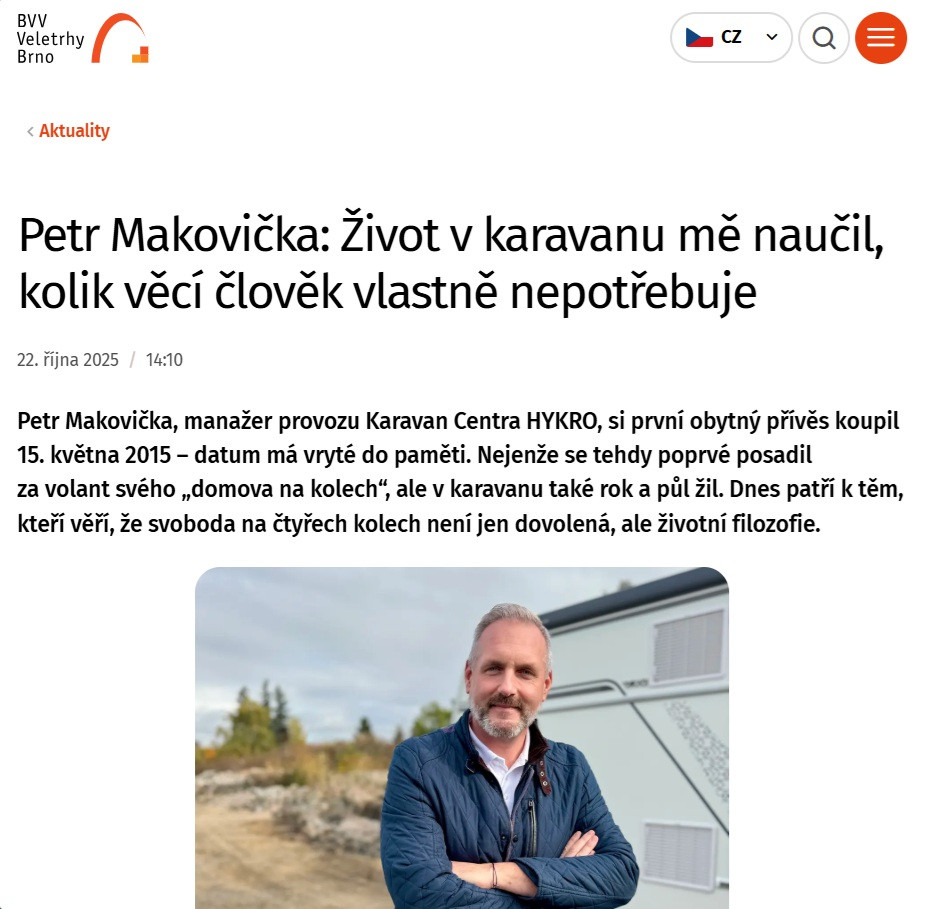 Petr Makovička, manažer provozu Karavan Centra HYKRO, si první obytný přívěs koupil 15. května 2015 – datum má vryté do paměti. Nejenže se tehdy poprvé posadil za volant svého „domova na kolech“, ale v karavanu také rok a půl žil. Dnes patří k těm, kteří věří, že svoboda na čtyřech kolech není jen dovolená, ale životní filozofie.