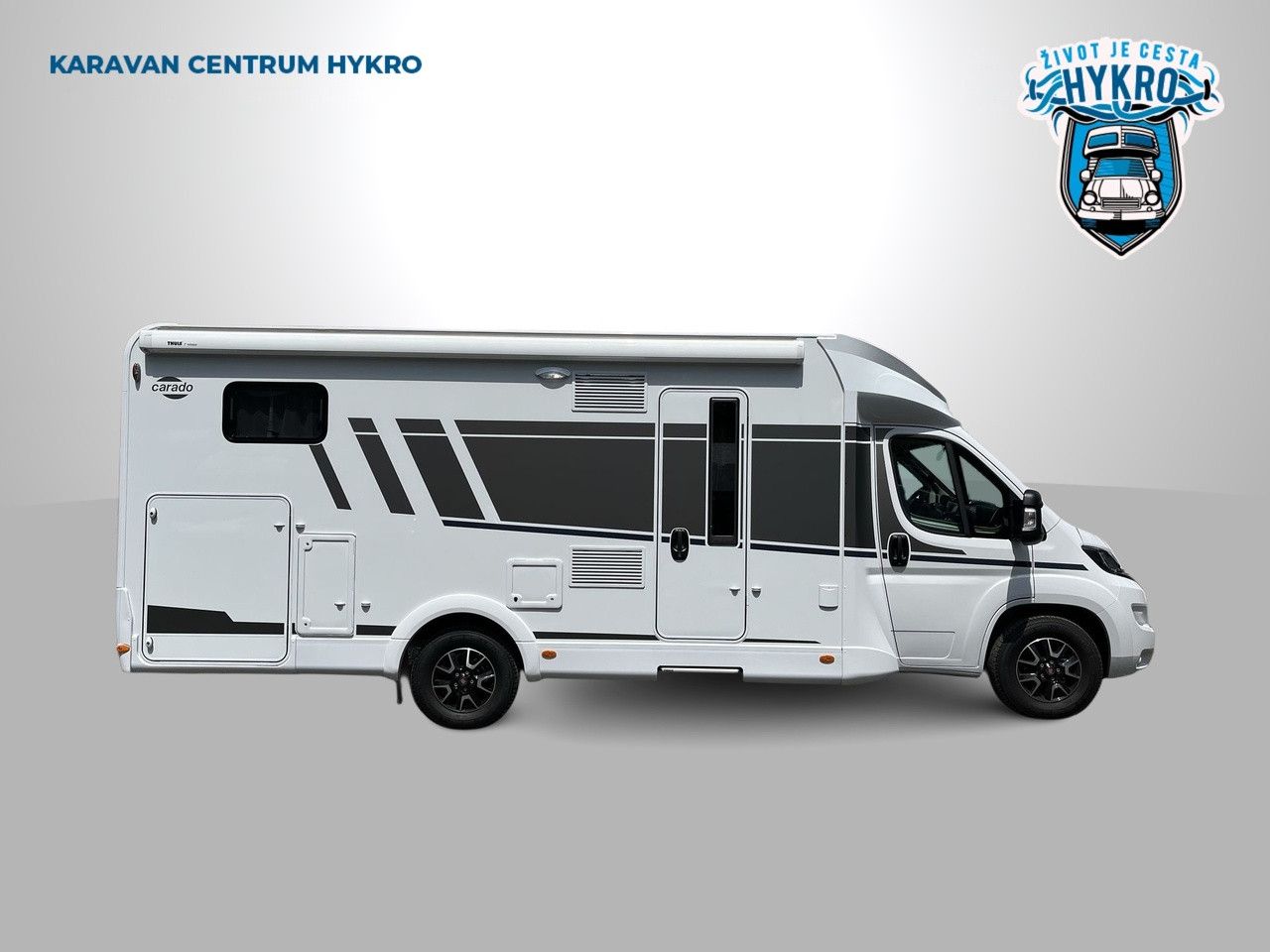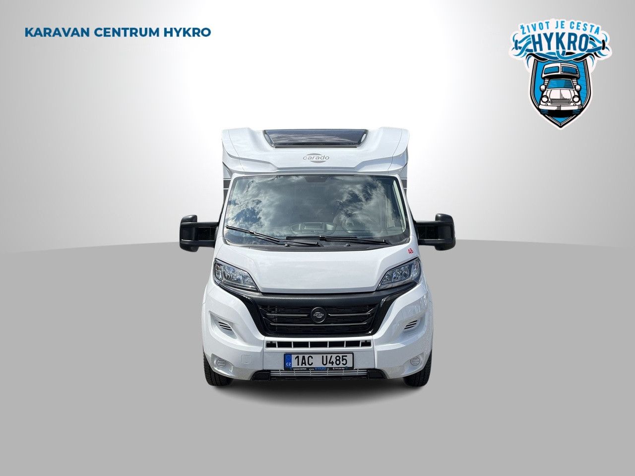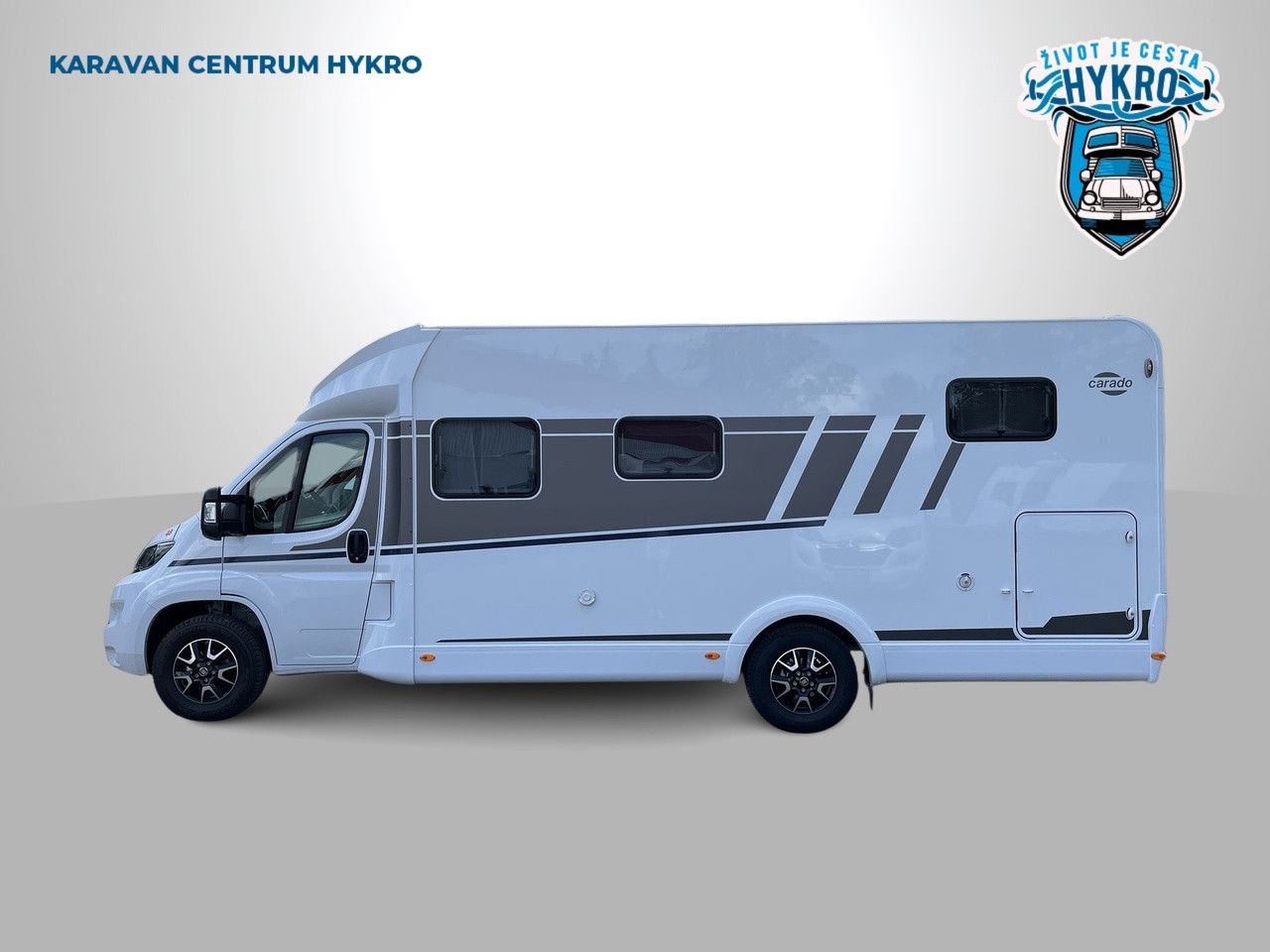 Krásně řešený polointegrovaný vůz s prostornou garáží, vhodný pro čtyři osoby na jízdu i spaní. Jeho velikou předností je, že má toaletu i sprchu oddělenou samostatně a dveřmi od toalety se dá uzavřít celá zadní část, takže máte naprosté soukromí na vykonání hygieny a v přední částí zatím může zbytek posádky dělat snídani nebo hrát karty :-)