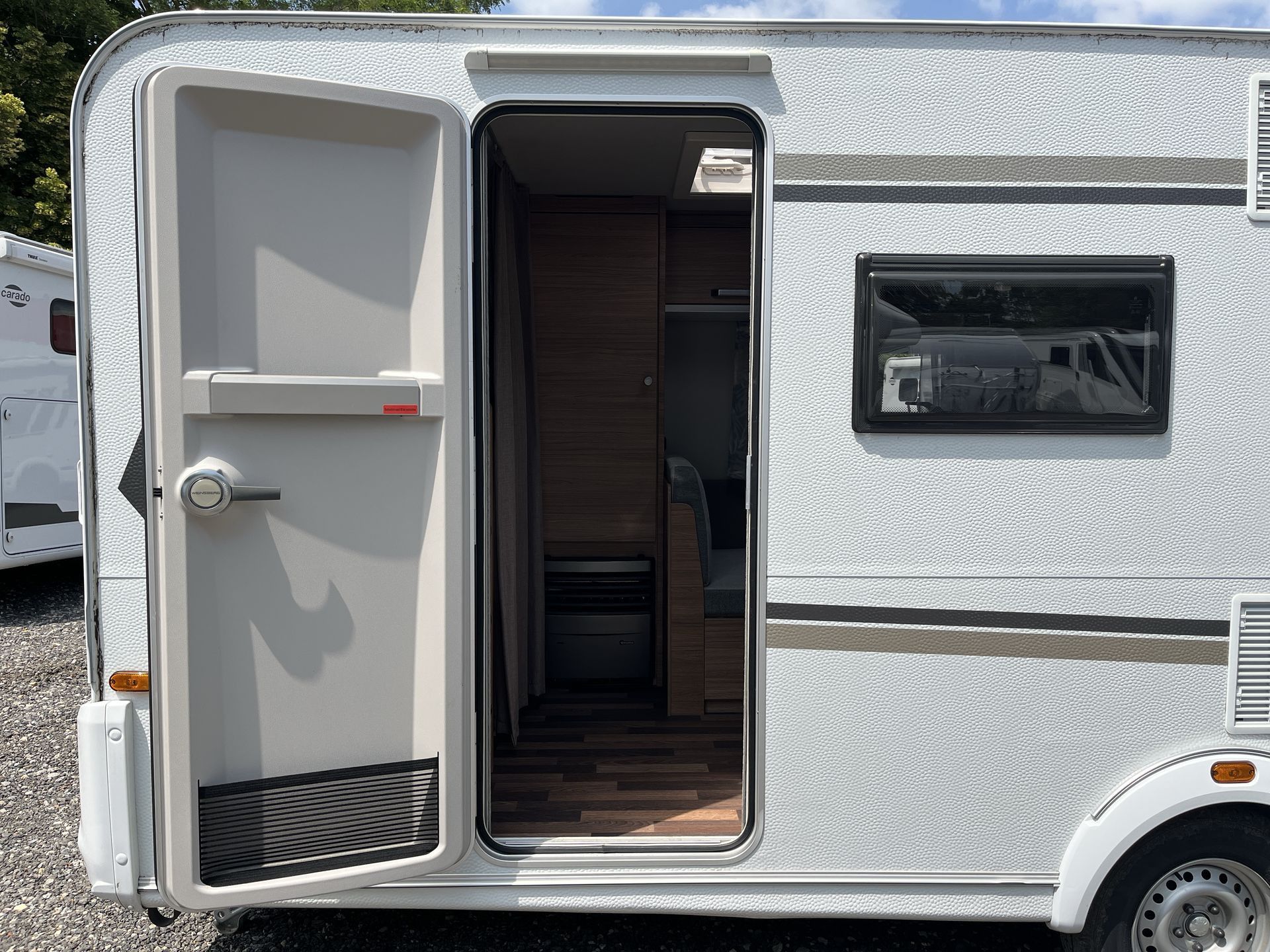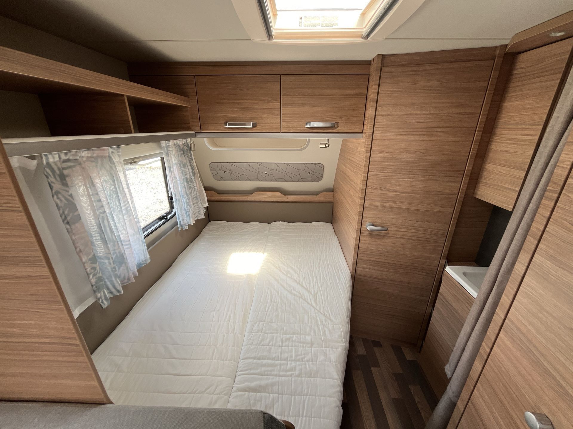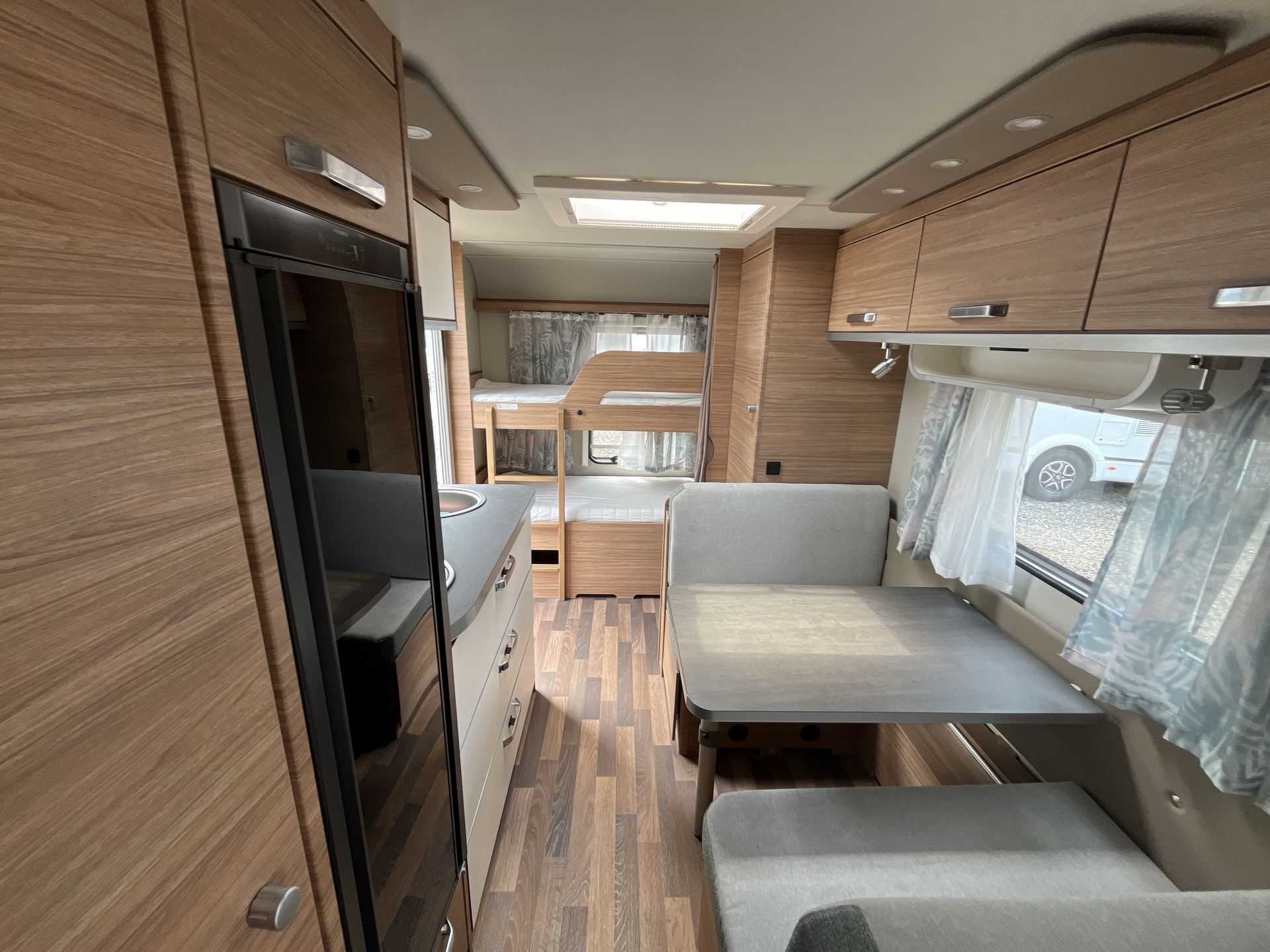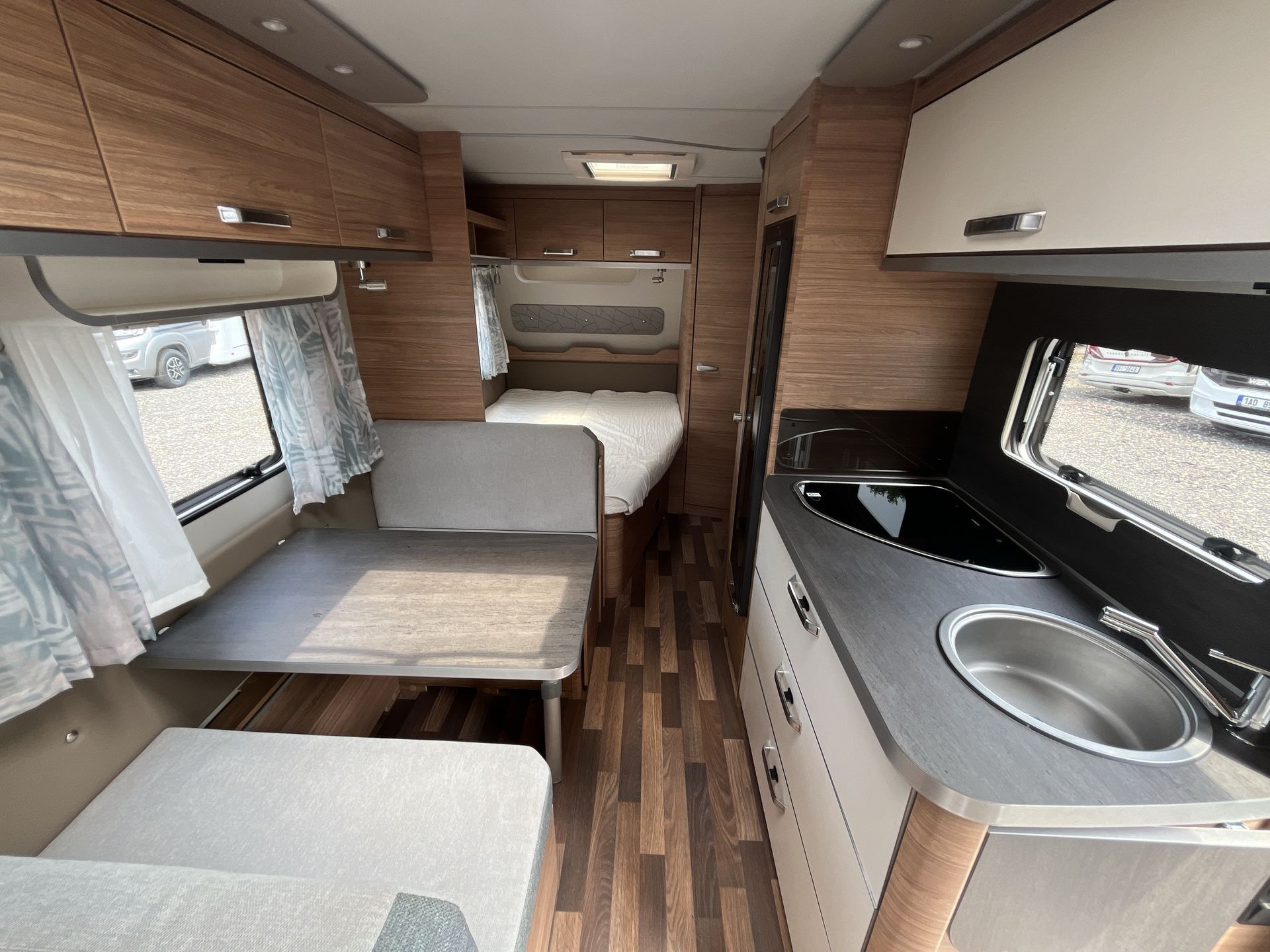 Oblíbený karavan s francouzským lůžkem vpředu, rozkládacím sezením uprostřed a dvěma palandama vzadu.