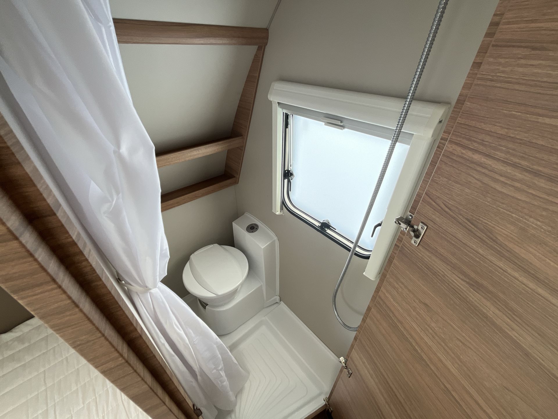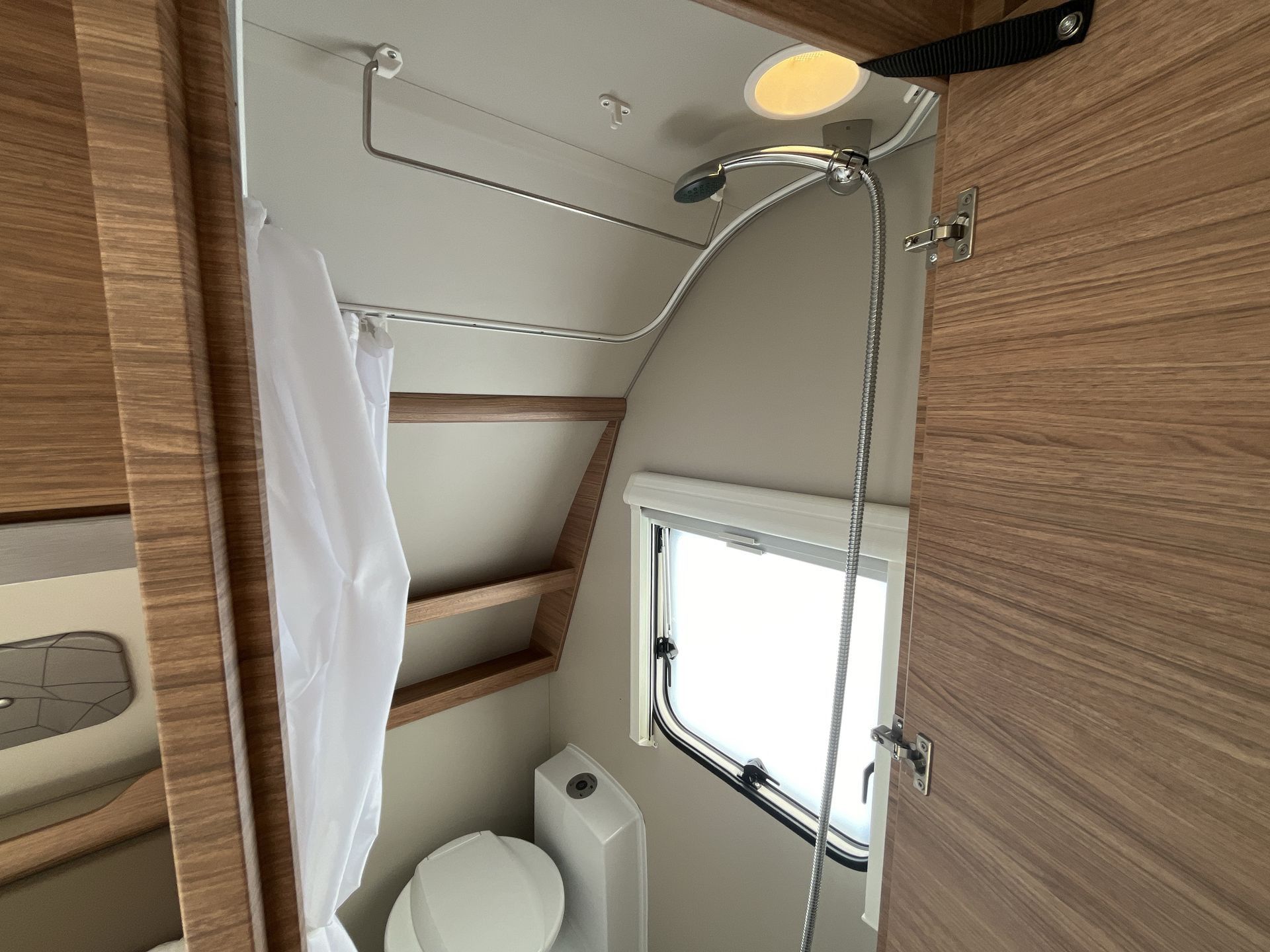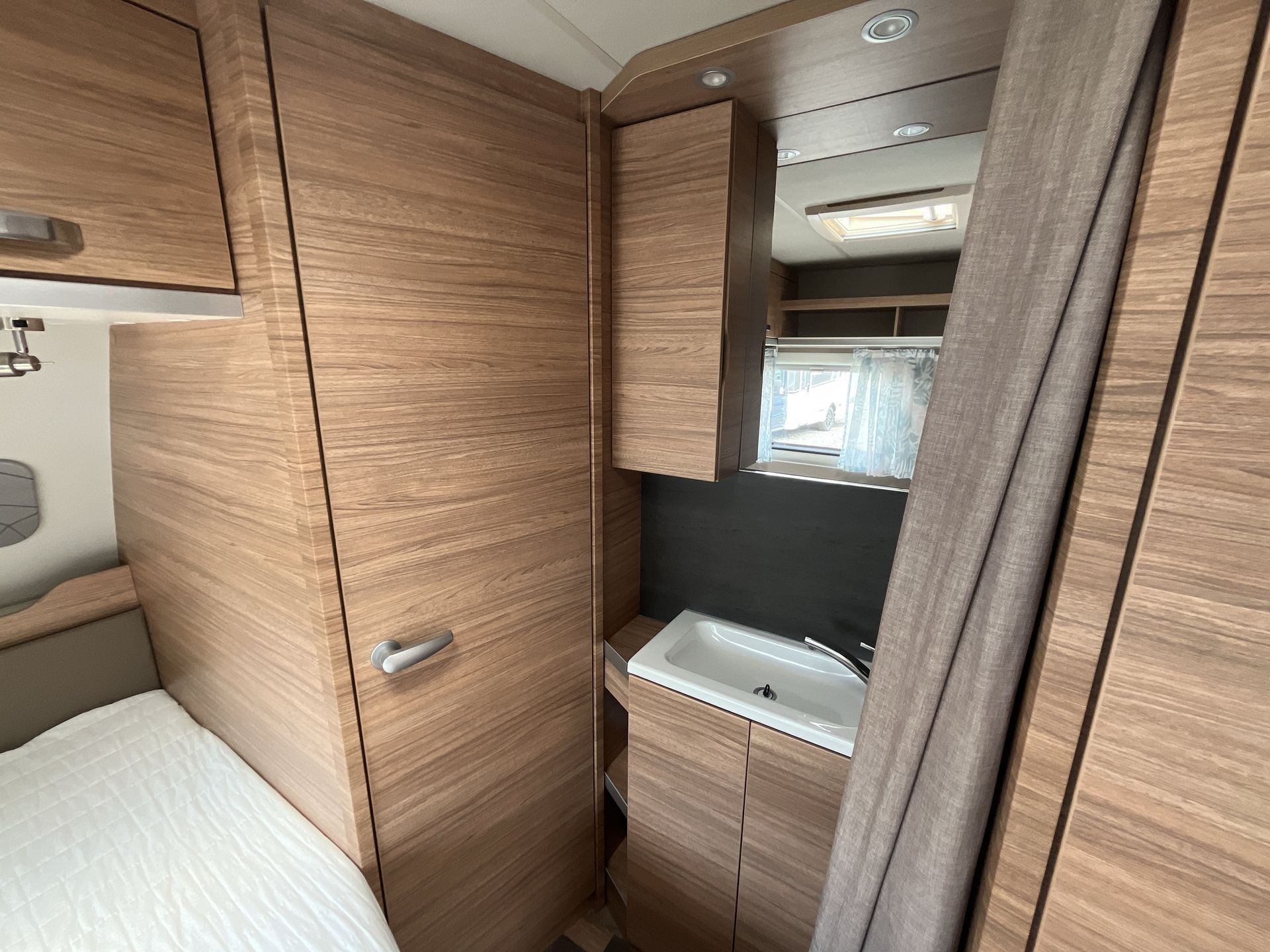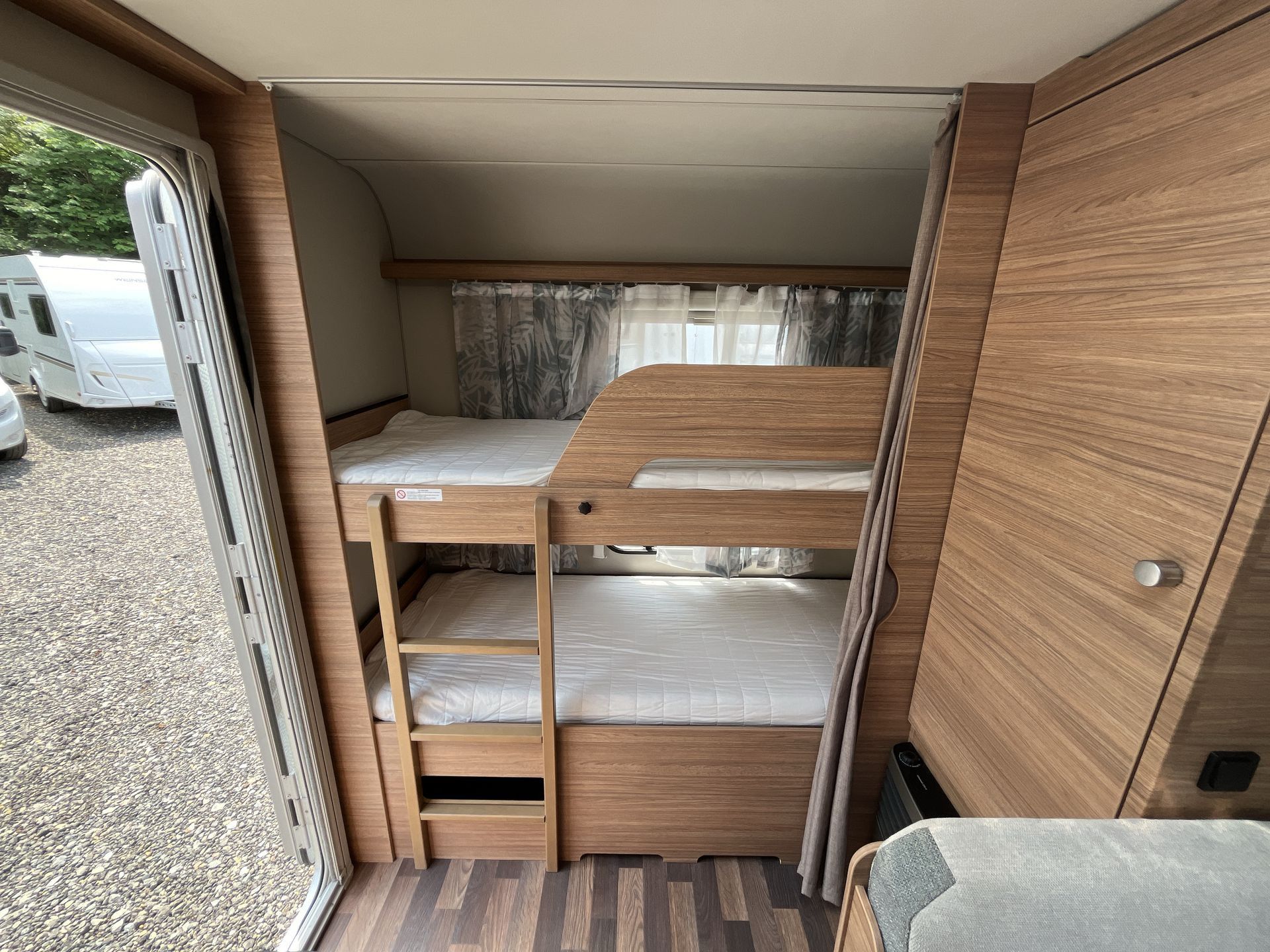Oblíbený karavan s francouzským lůžkem vpředu, rozkládacím sezením uprostřed a dvěma palandama vzadu.