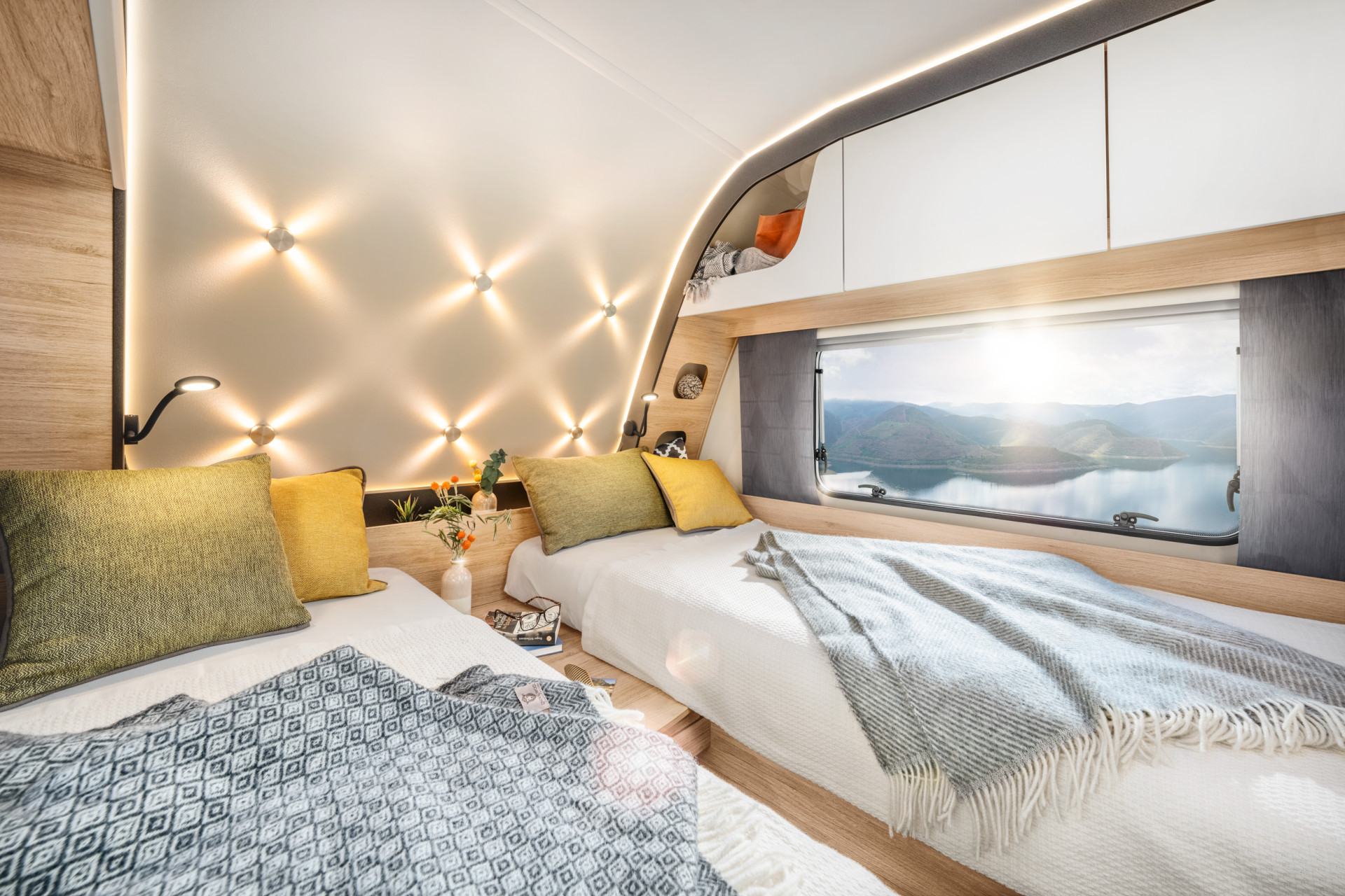 •   SMART PAKET: stabilizátor závěsu, kombinované roletky v oknech, 12V rozvod teplého vzduchu, vestavěná nádrž vody 45 litrů, zesílené stabilizační vzpěry, vodní filtrační systém "BWT"