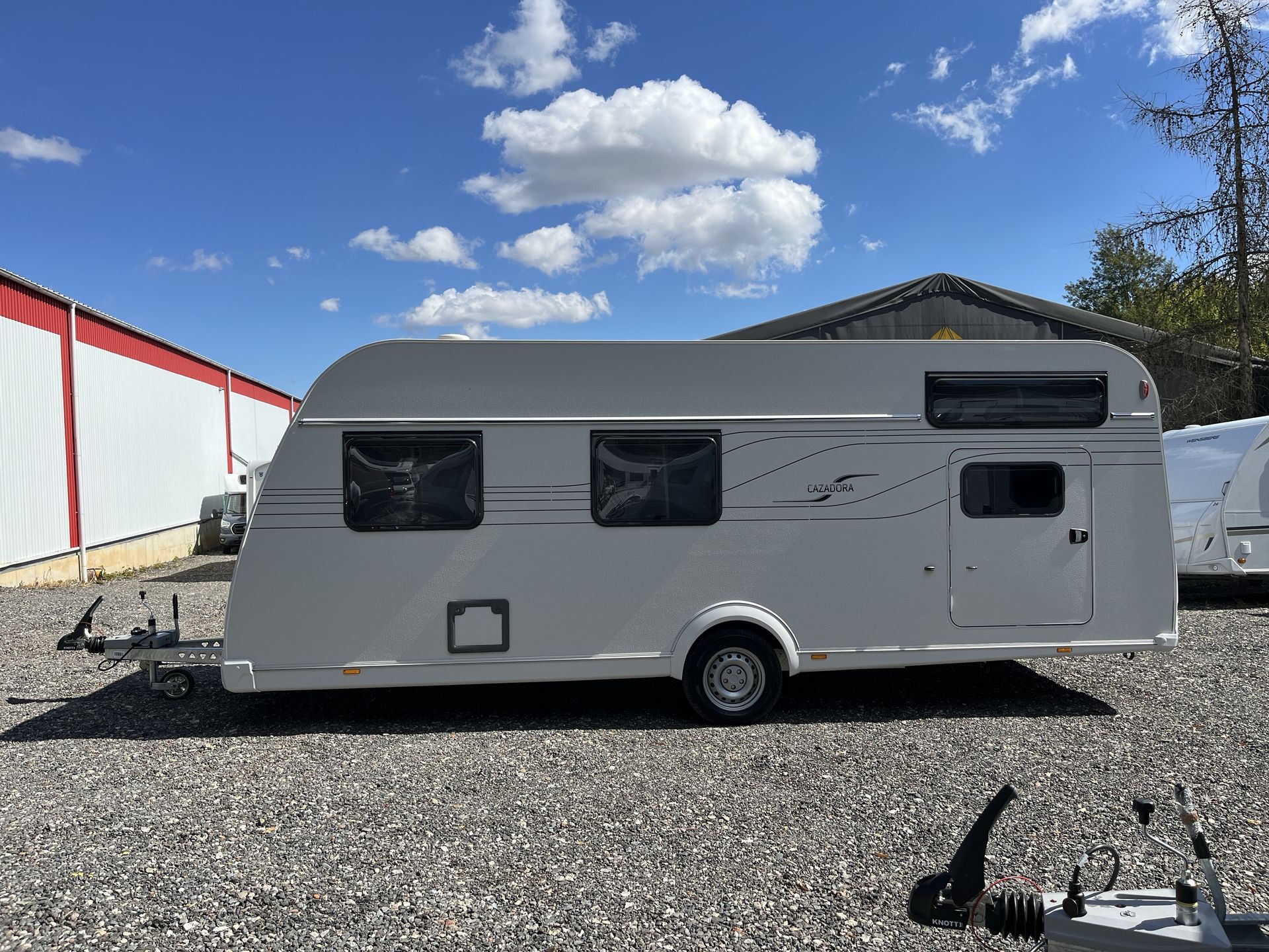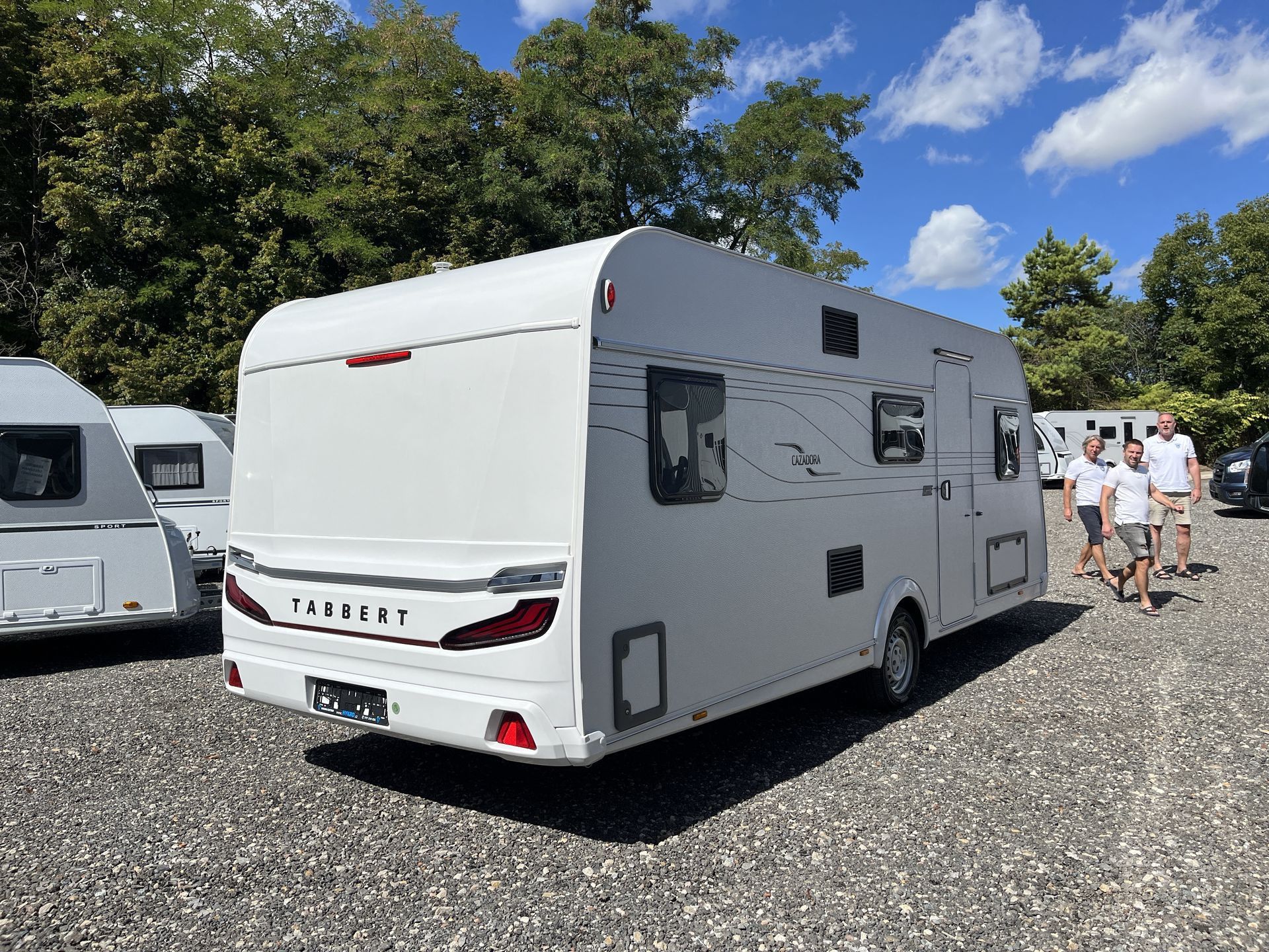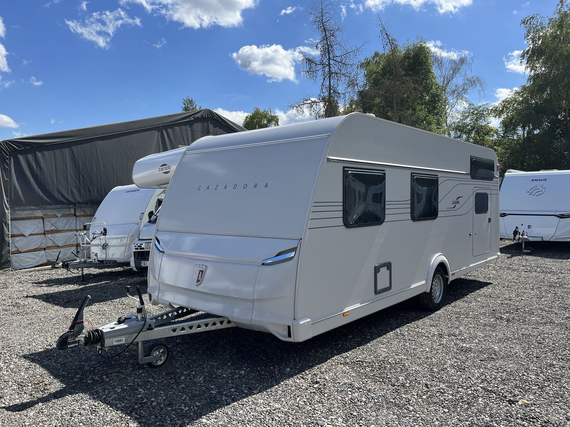 Skladem - rodinný přívěs Tabbert Cazadora 550 DMK s příčným dvojlůžkem, palandami a rozkládací sedací soupravou. Fotografie jsou pouze ilustrační!