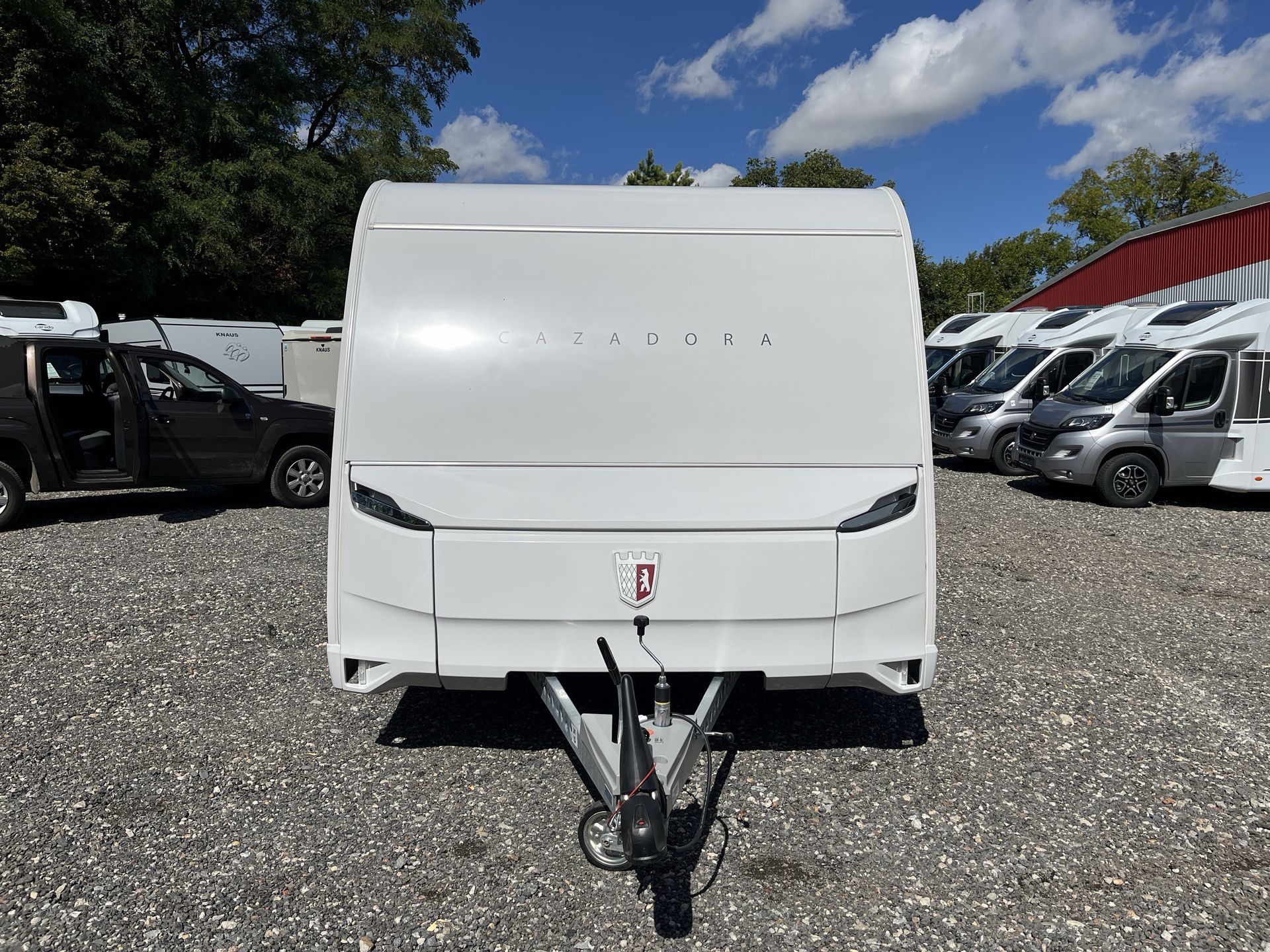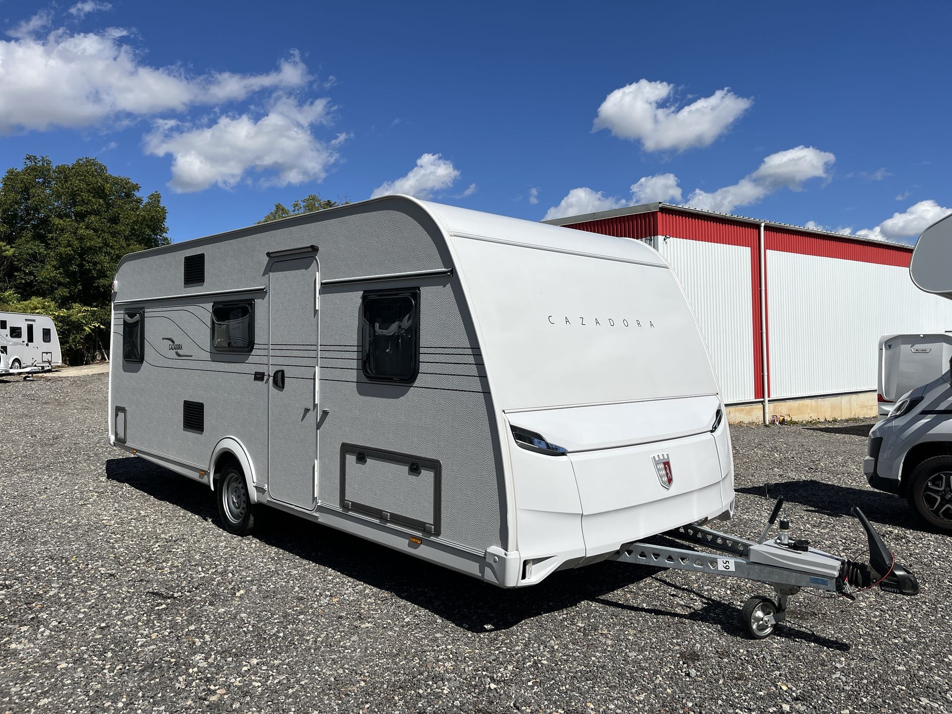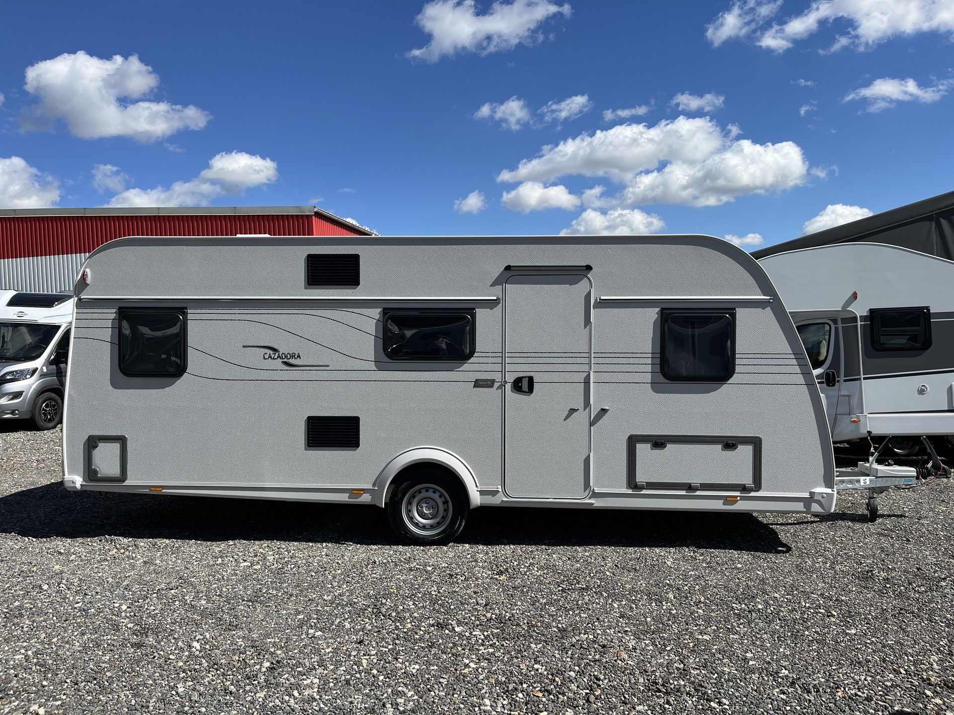 Skladem - rodinný přívěs Tabbert Cazadora 550 DMK s příčným dvojlůžkem, palandami a rozkládací sedací soupravou. Fotografie jsou pouze ilustrační!