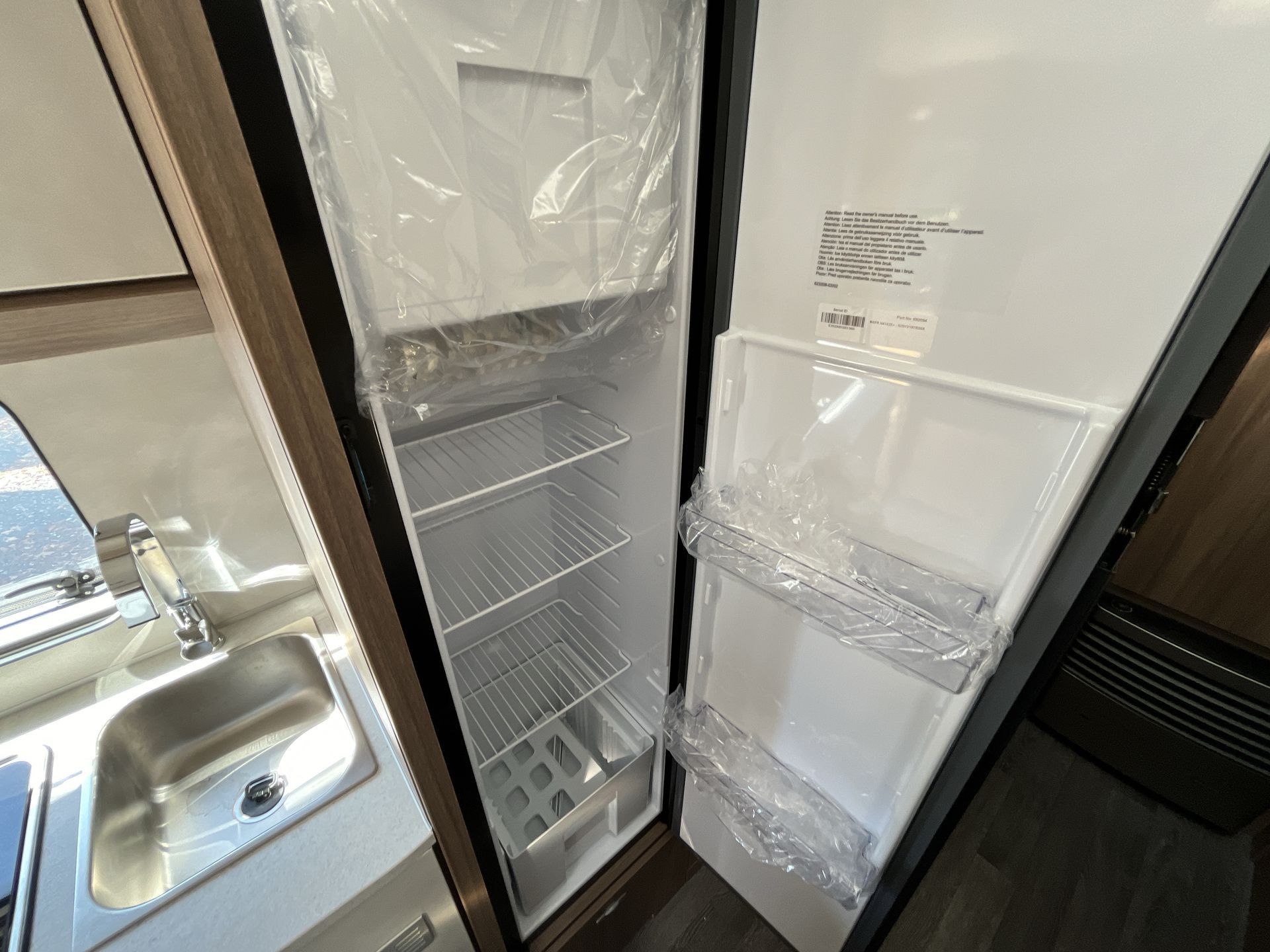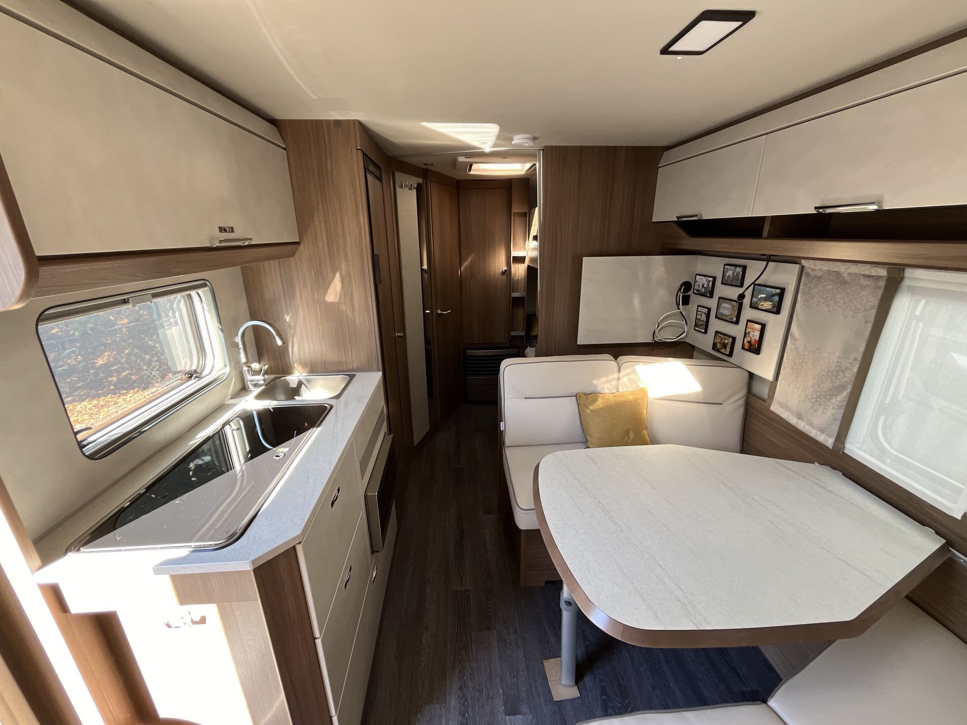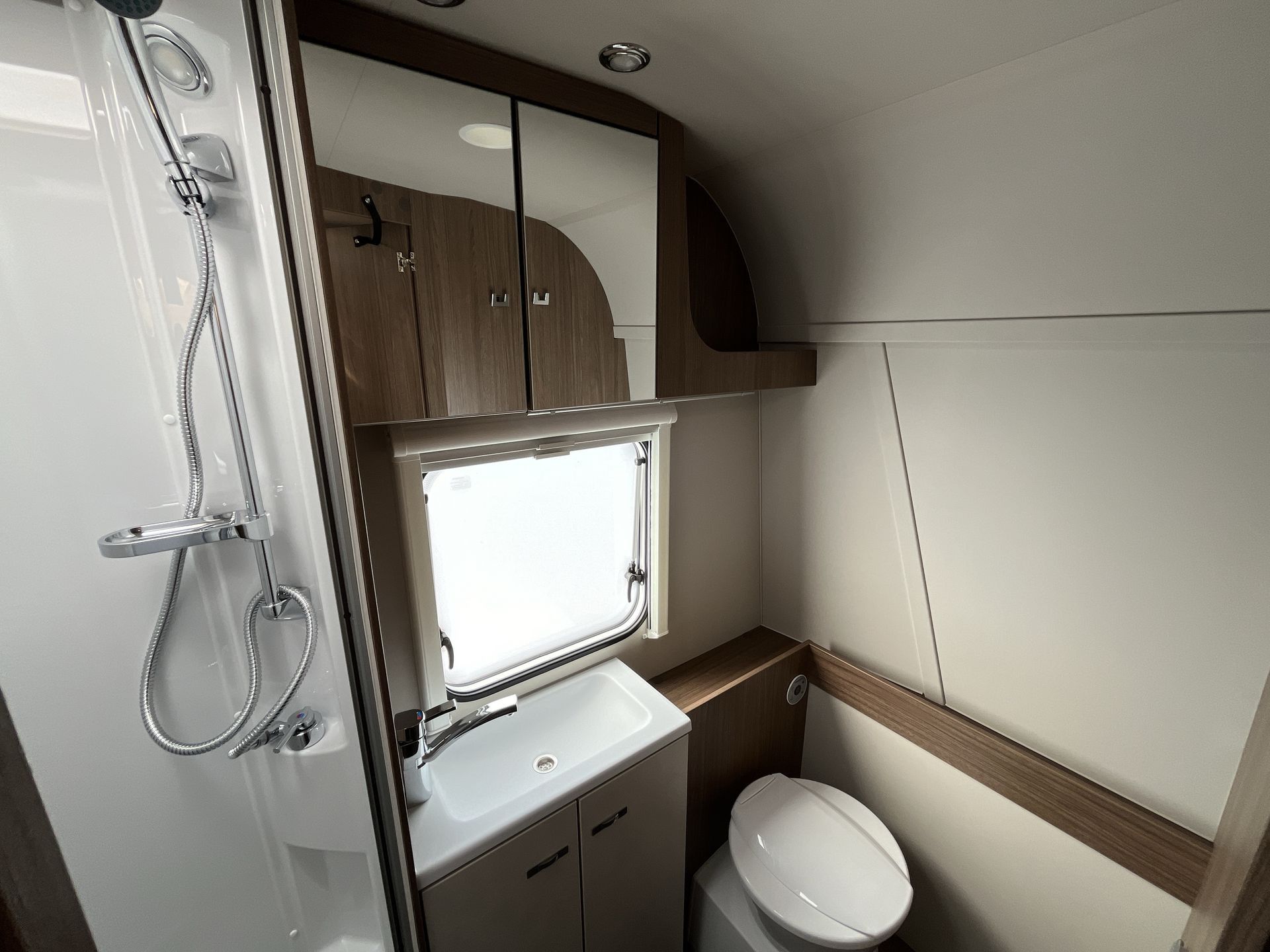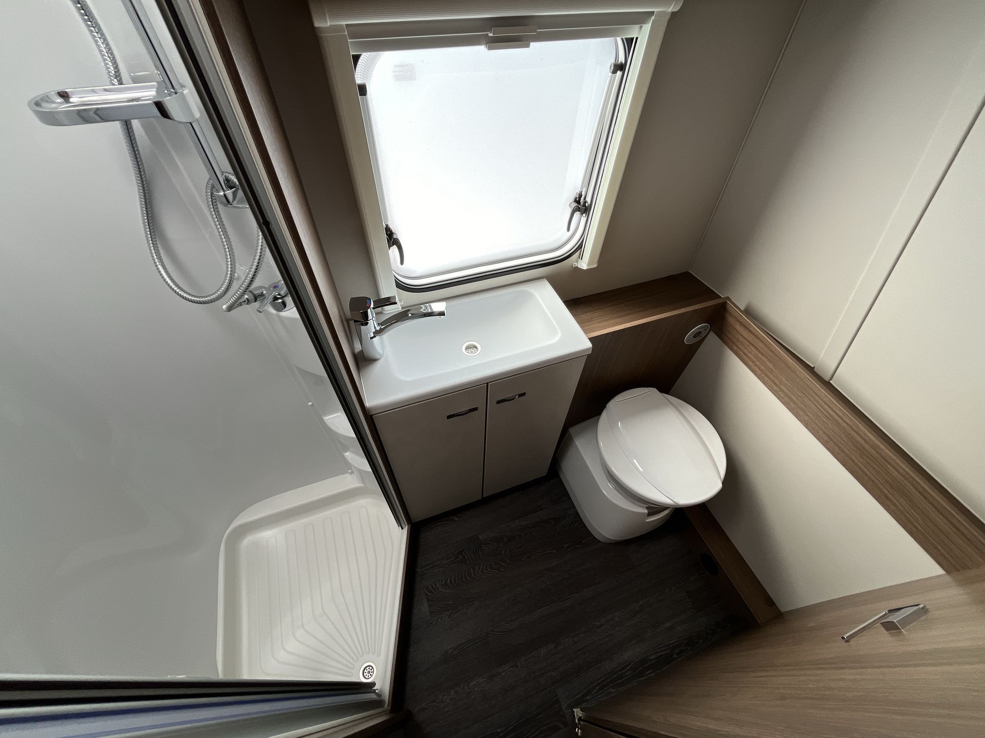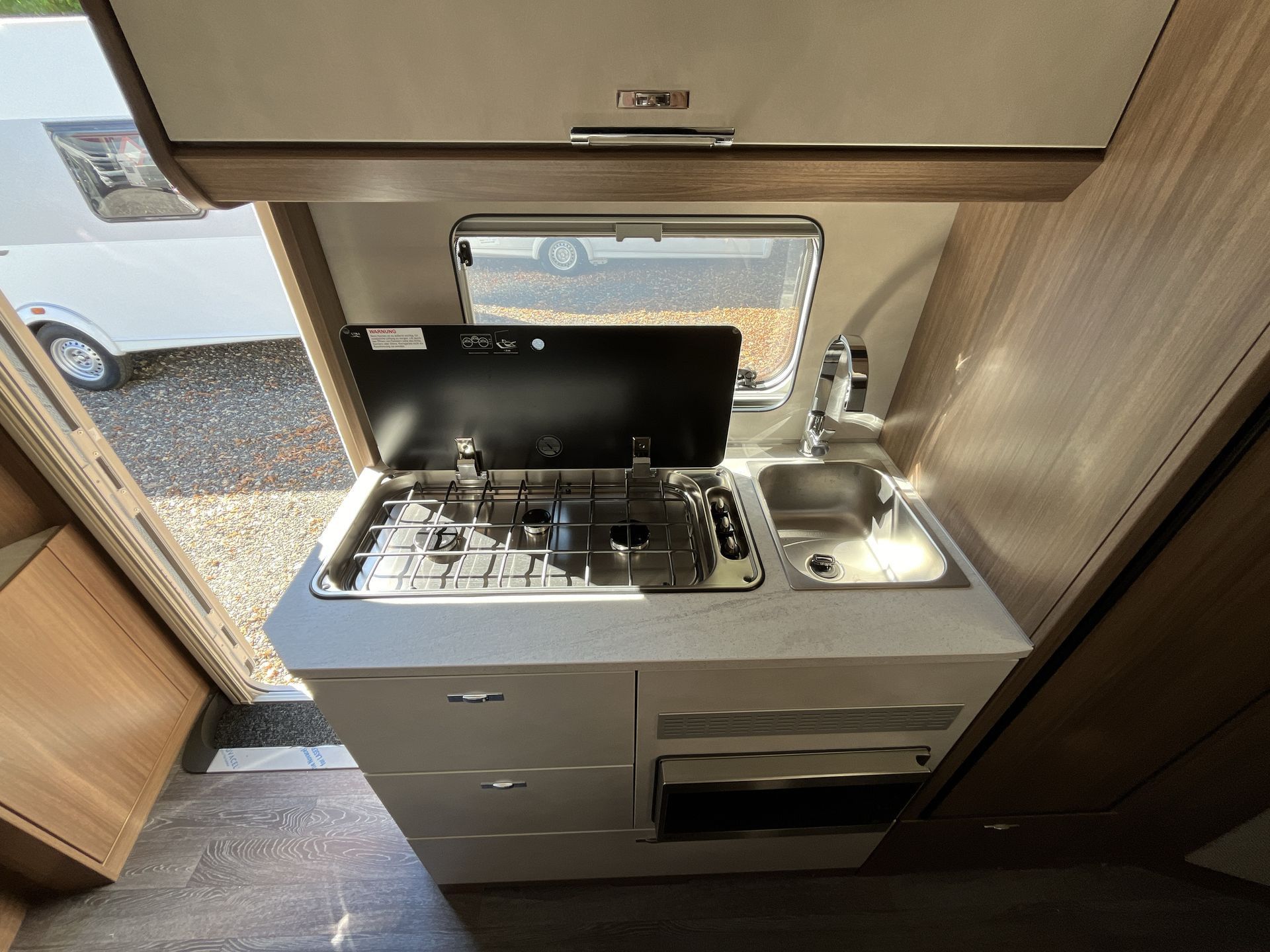 KUCHYŇ / KOUPELNA: kombinace vařiče a dřezu vč. 3 plotýnkového vařiče s elektrickým zapalováním a děleným skleněným krytem, lednice 142 l se systémem AES, skříňka v koupelně se zrcadlem a poličkami, utěsněná záchodová šachta, sprchová vanička, vybavení sprchy, oddělený komfortní sprchový kout se skládacími dveřmi, otočná kazetová toaleta Dometic