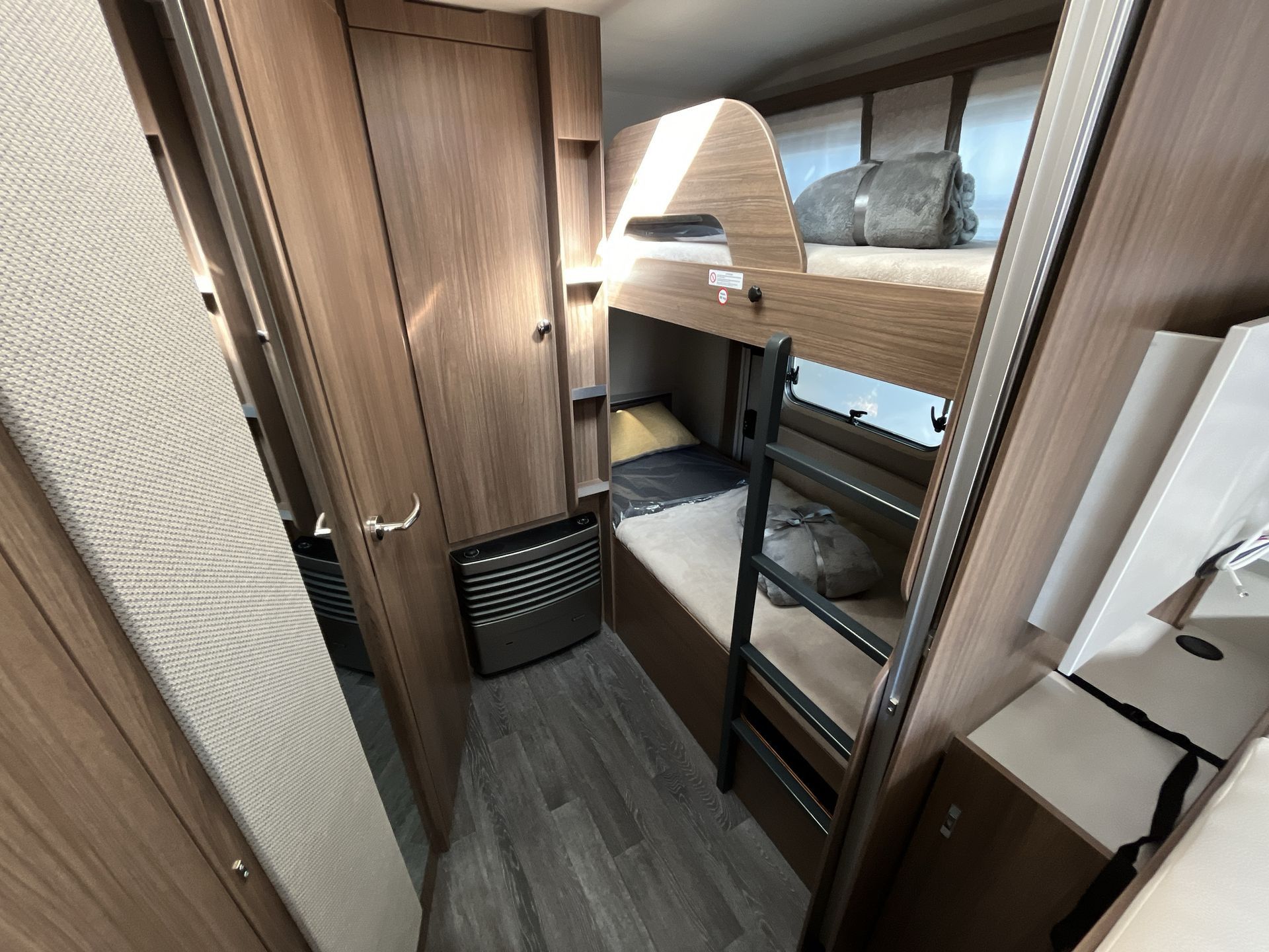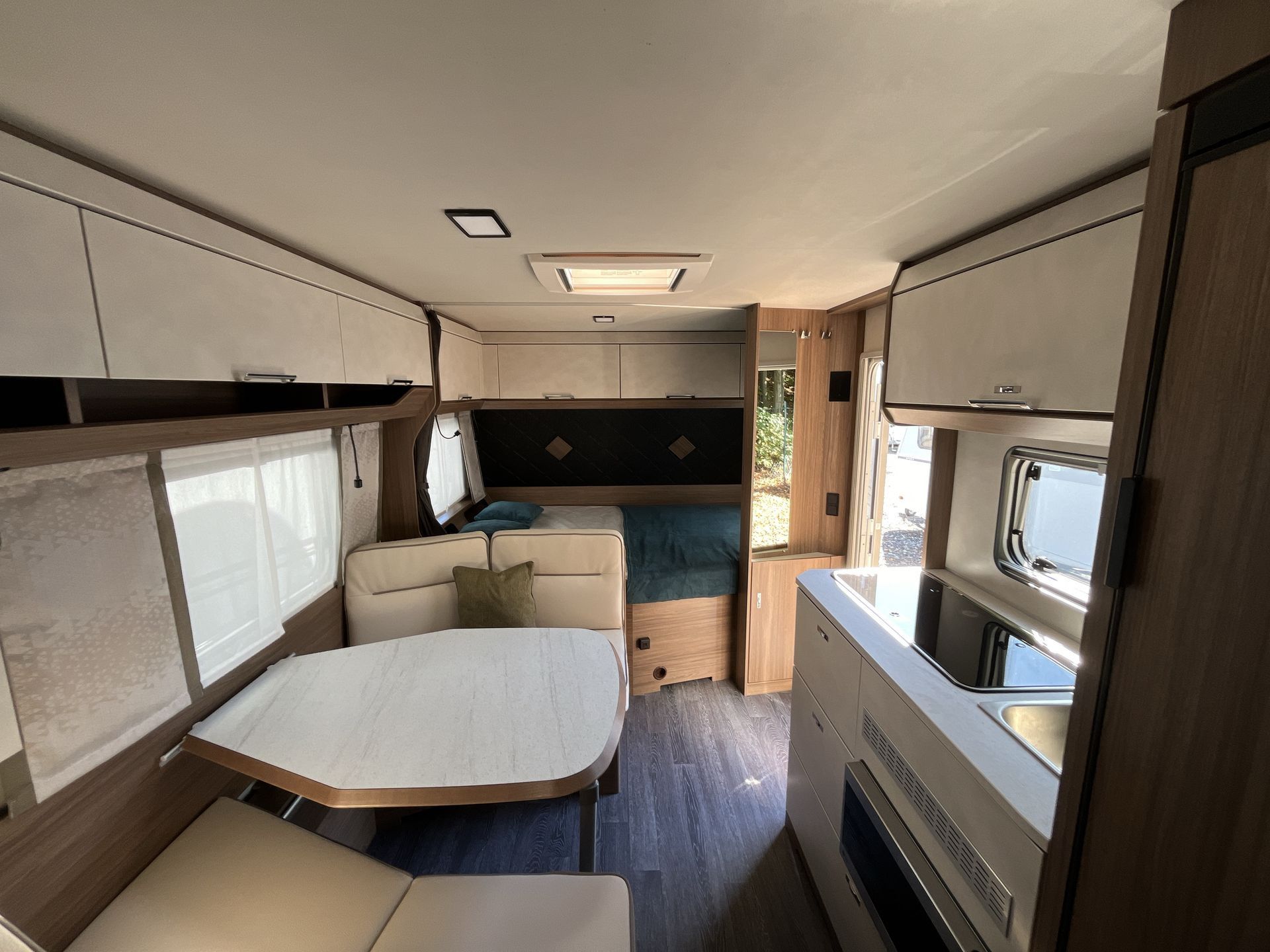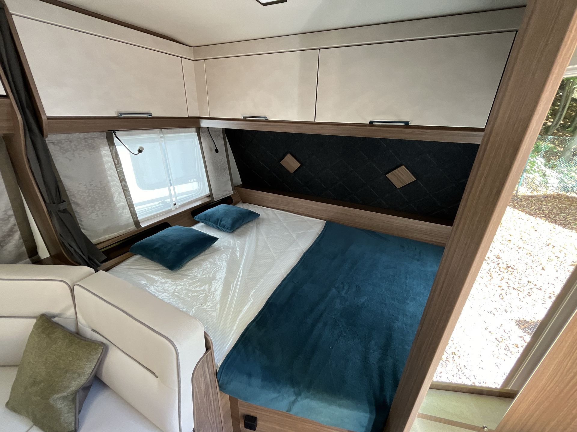 OBYTNÁ ČÁST: skříňky a úložné prostory s odvětráním, dekor nábytku Berberino, chromované rukojeti skříněk, vinylová podlaha, uzávěr Safetylock u horních skříněk kuchyňky, látková skládací zástěna (k oddělení ložnice), akustická stěna u TV, přihrádky a další úložné prostory u sezení, luxusní konstrukce postele s jednodílným lamelovým roštem, dvojpalanda se 2 okny v zadní nebo boční stěně, obložení nad postelí, čalounění VANILLA LEAF