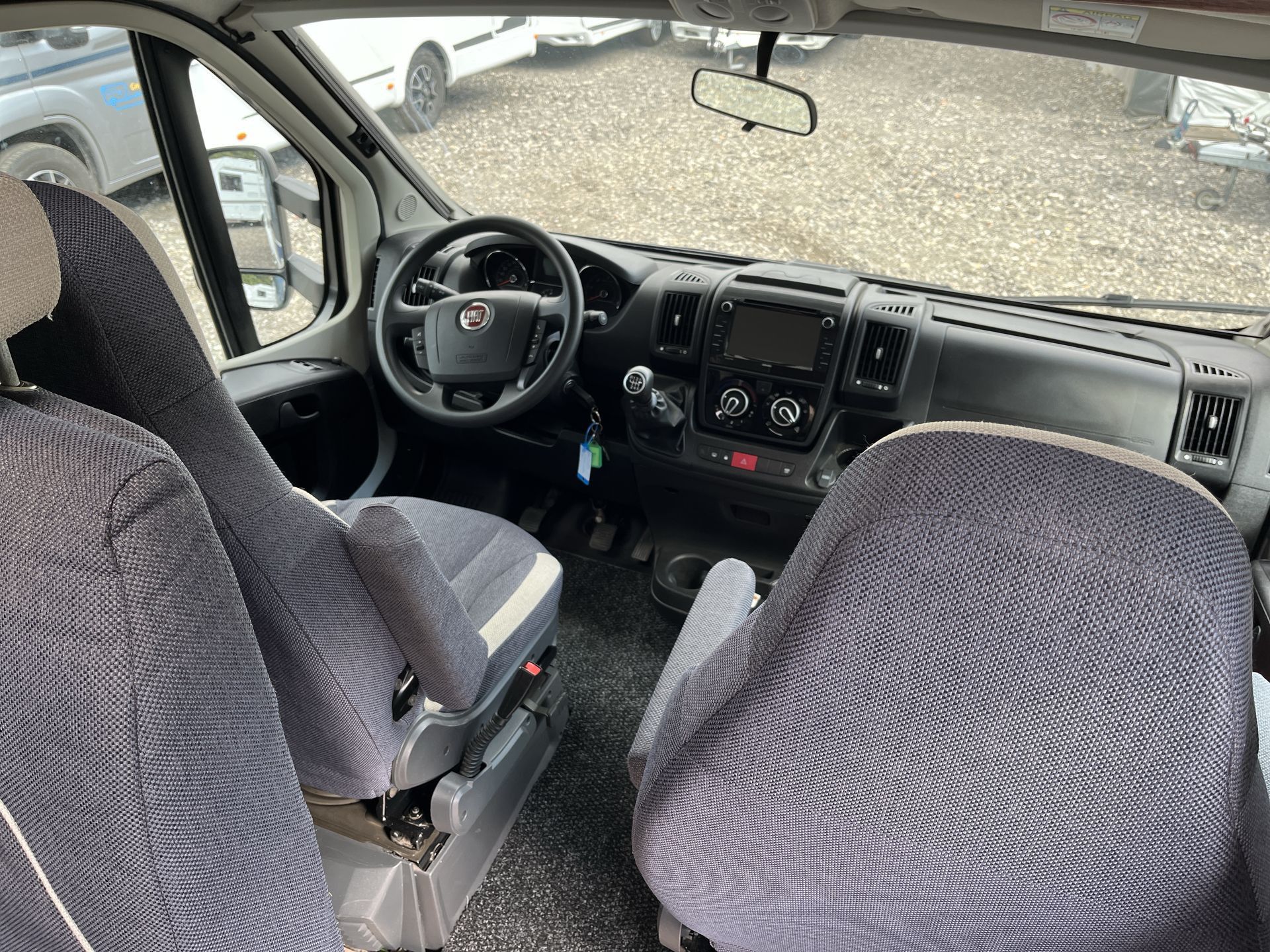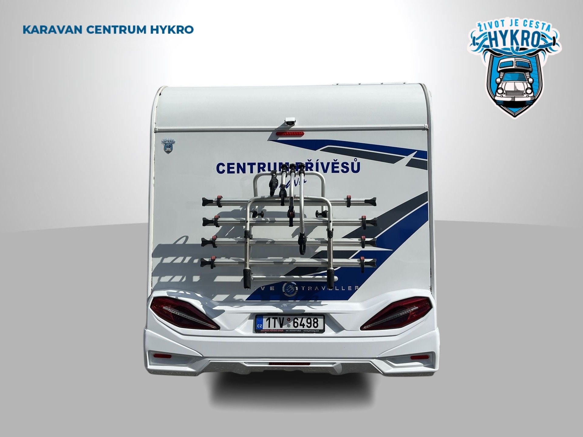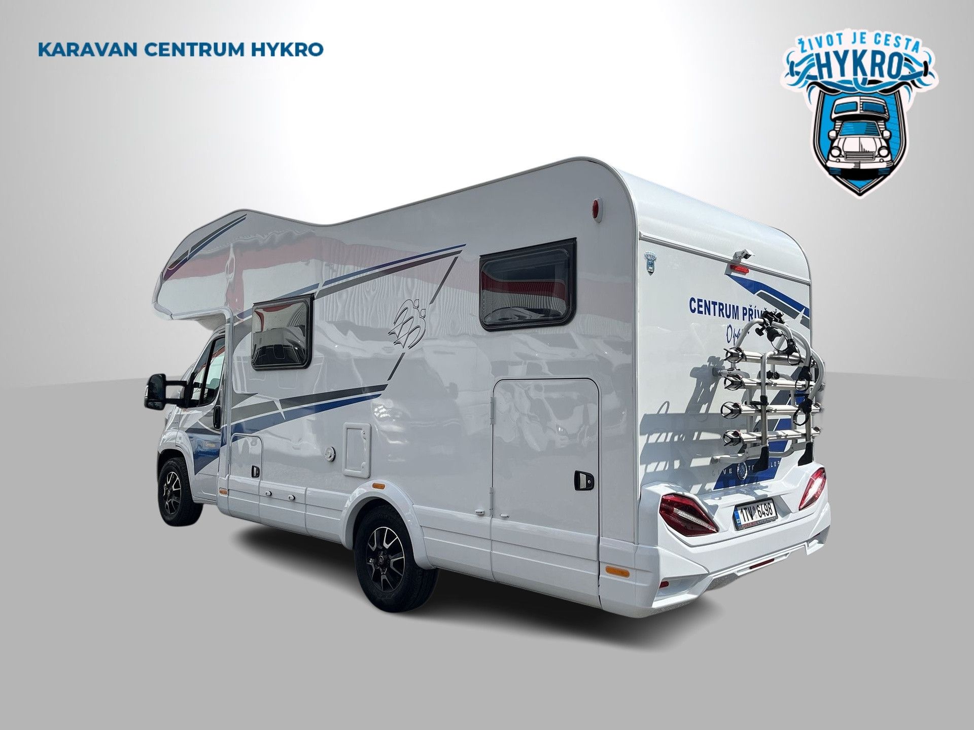 Bohatá výbava: motor 150 PS (bez AdBlue), motorová klimatizace, elektrická okna i zrcátka, tempomat, 2x airbag, ovládání radia na volantu, remis žaluzie v kabině řidiče, moskytiéra ve vstupních dveřích, Truma iNet systém, digitální panel Truma CP Plus, izolovaná a vyhřívaná odpadní nádrž, střešní okno Midi Heki s osvětlením, posuvný žebřík alkovny, levé dveře garáže, levé zadní okno, rezervní kolo, nádrž nafty 90 l, DuoControl Truma CS, 190 l lednice