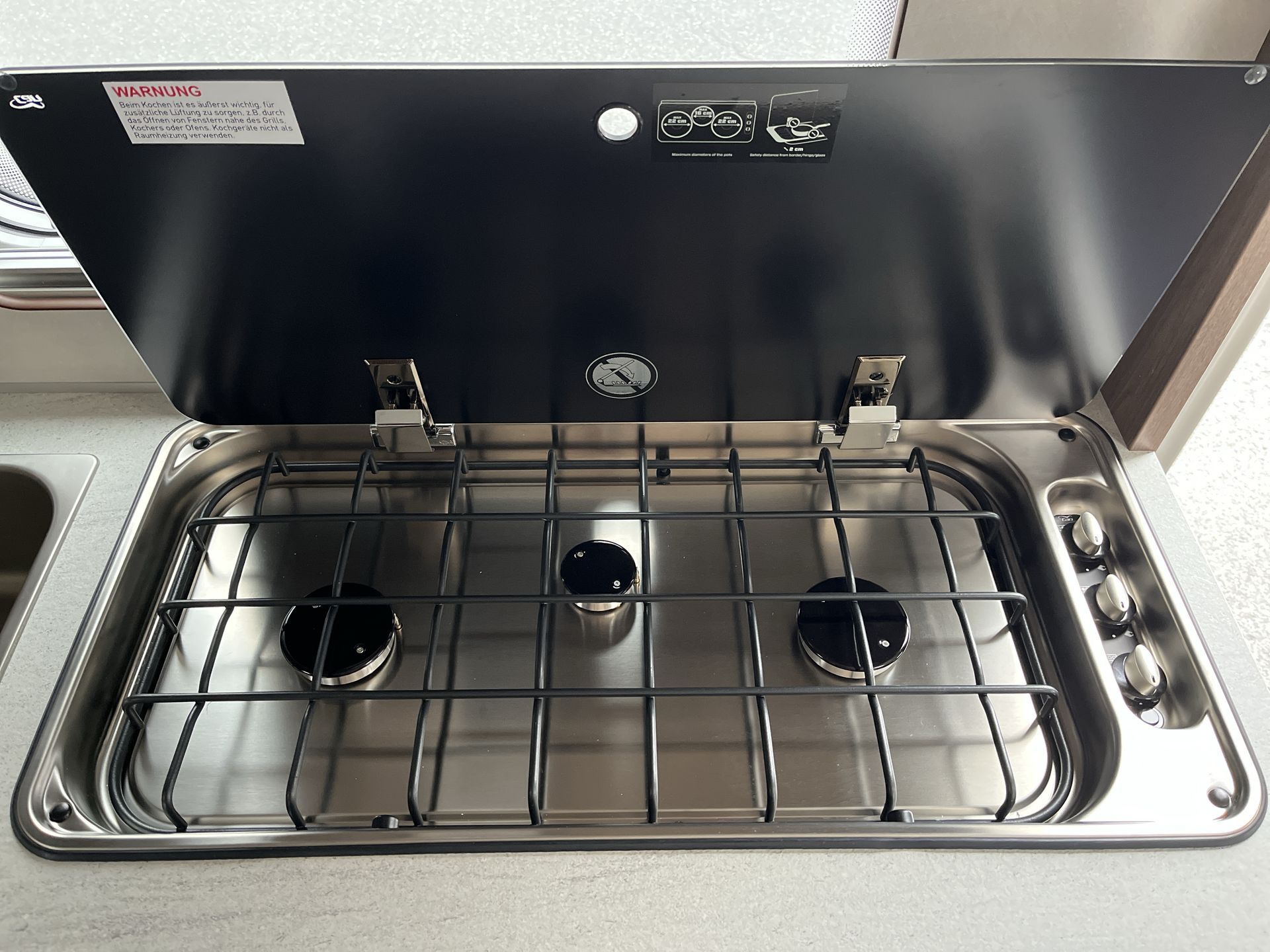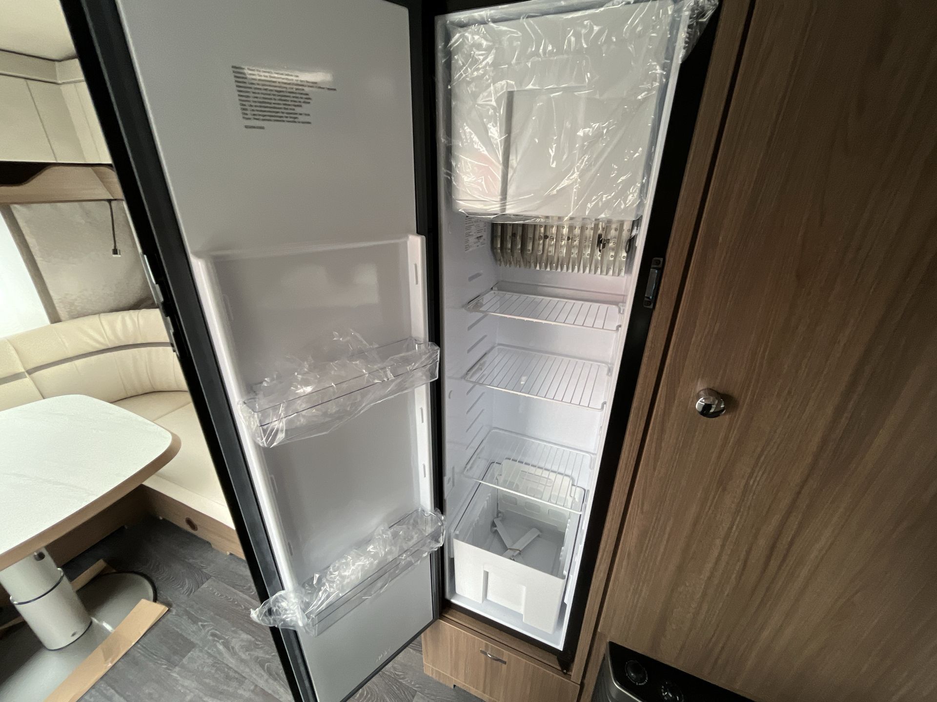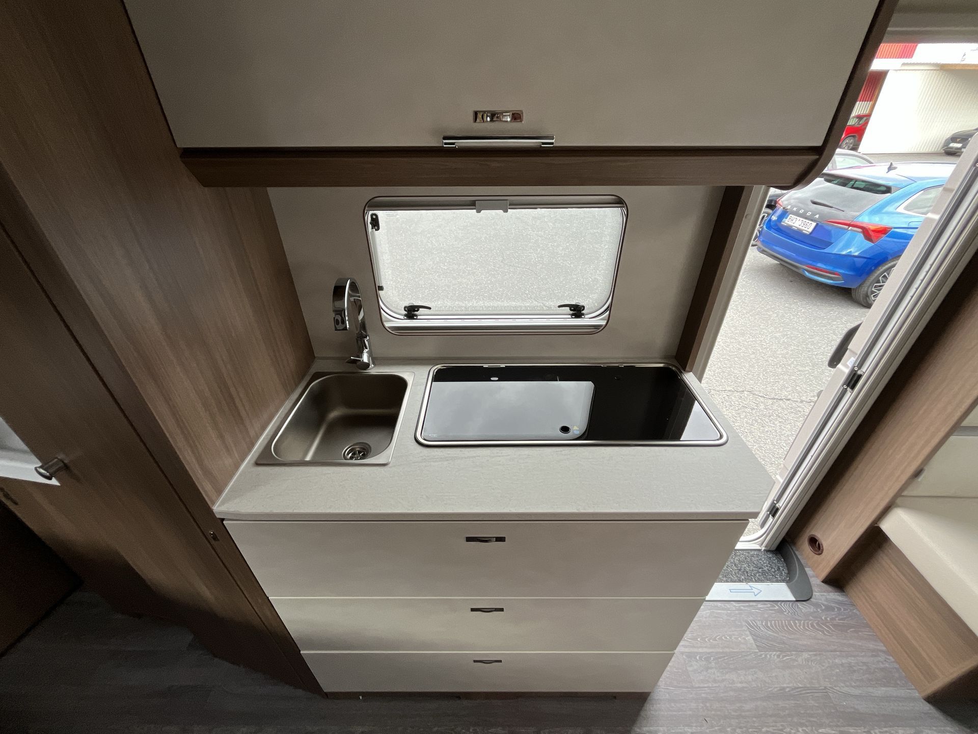 KUCHYŇ / KOUPELNA: kombinace vařiče a dřezu vč. 3 plotýnkového vařiče s elektrickým zapalováním a děleným skleněným krytem, lednice 142 l se systémem AES, skříňka v koupelně se zrcadlem a poličkami, utěsněná záchodová šachta, sprchová vanička, vybavení sprchy, oddělený komfortní sprchový kout se skládacími dveřmi, otočná kazetová toaleta Dometic