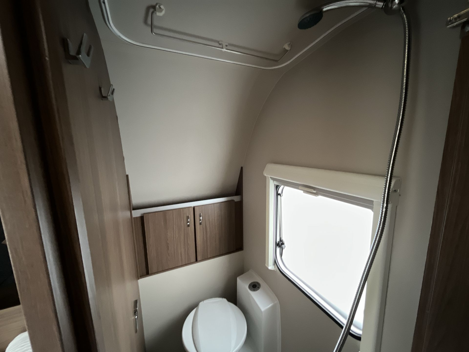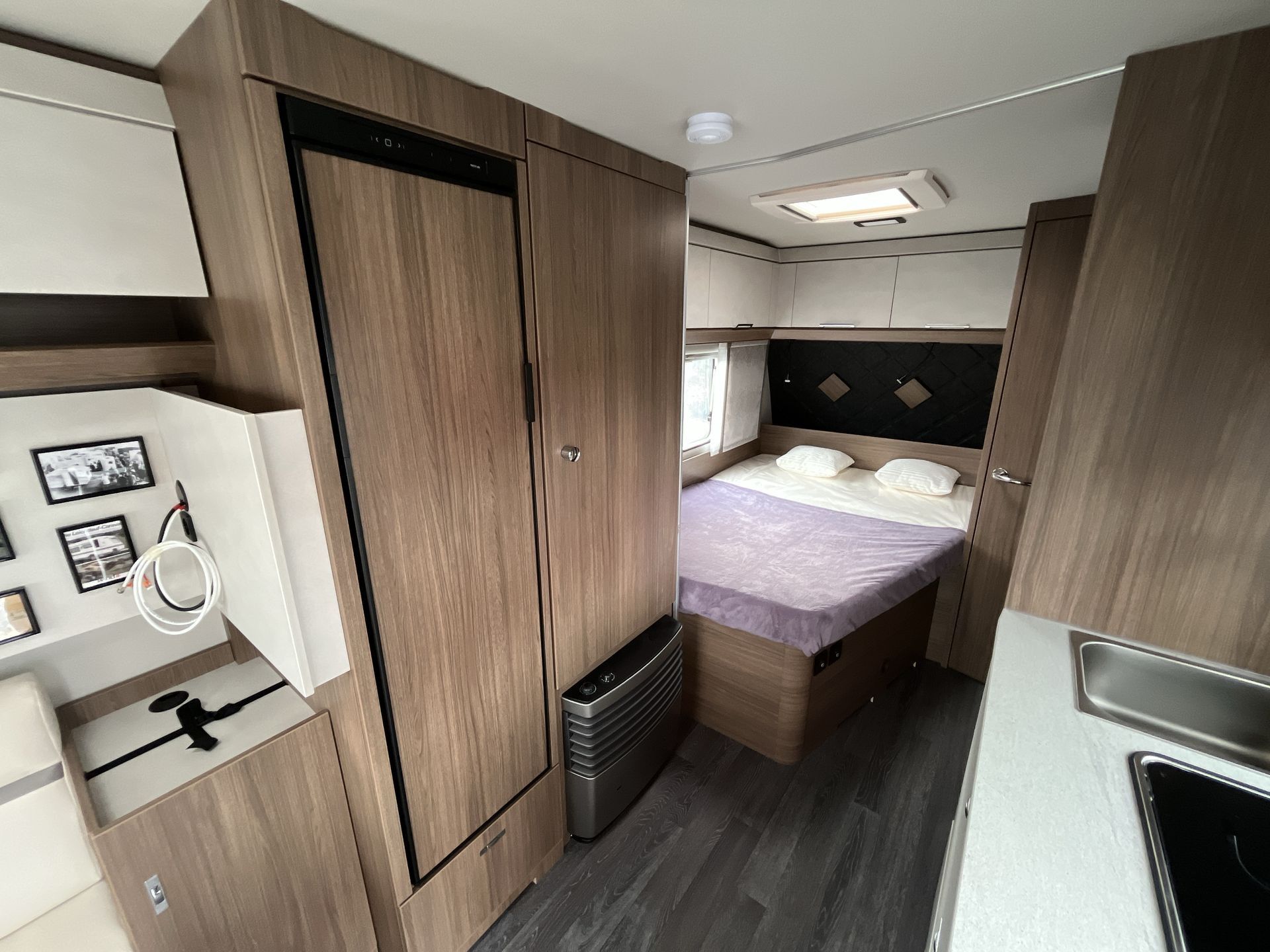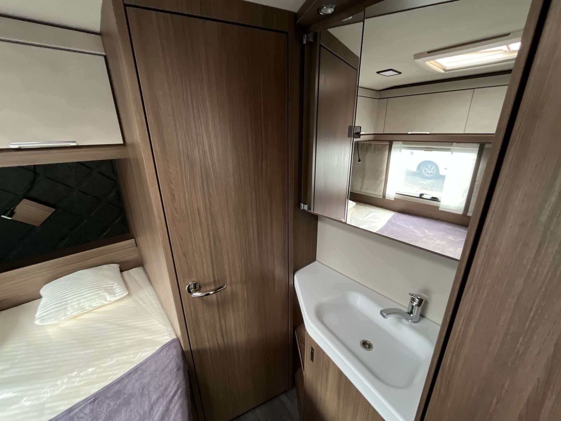 KUCHYŇ / KOUPELNA: kombinace vařiče a dřezu vč. 3 plotýnkového vařiče s elektrickým zapalováním a děleným skleněným krytem, lednice 142 l se systémem AES, skříňka v koupelně se zrcadlem a poličkami, utěsněná záchodová šachta, sprchová vanička, vybavení sprchy, oddělený komfortní sprchový kout se skládacími dveřmi, otočná kazetová toaleta Dometic