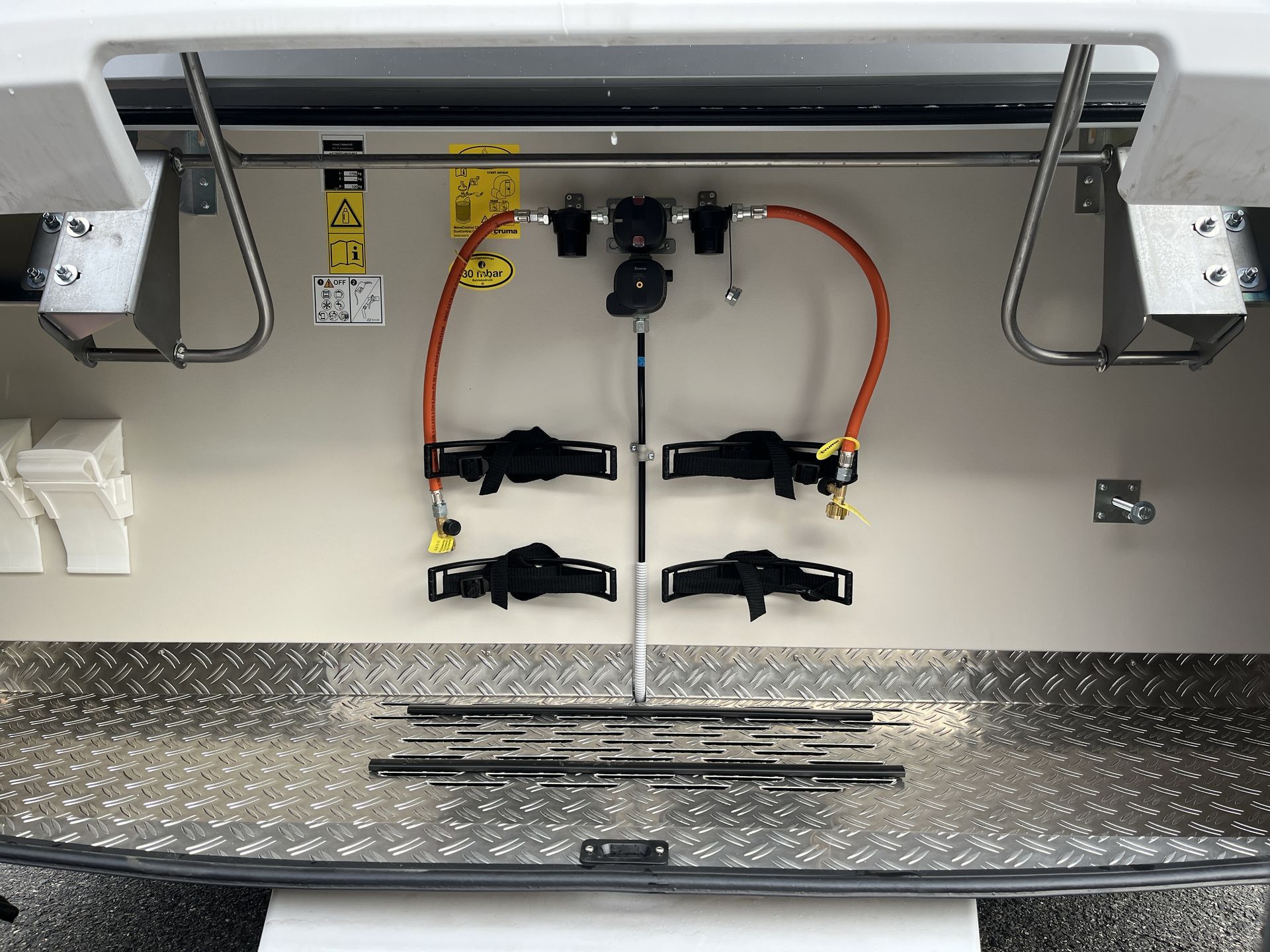 TOPENÍ / KLIMATIZACE / PLYN / VODA: plynový systém 30 mbar, detektor kouře, rozvod teplého vzduchu 12V, plynové topení Truma S 5004, ohřev vody Truma Therme (230V) s přípojkou do kuchyňky a koupelny, nádrž vody 45 l