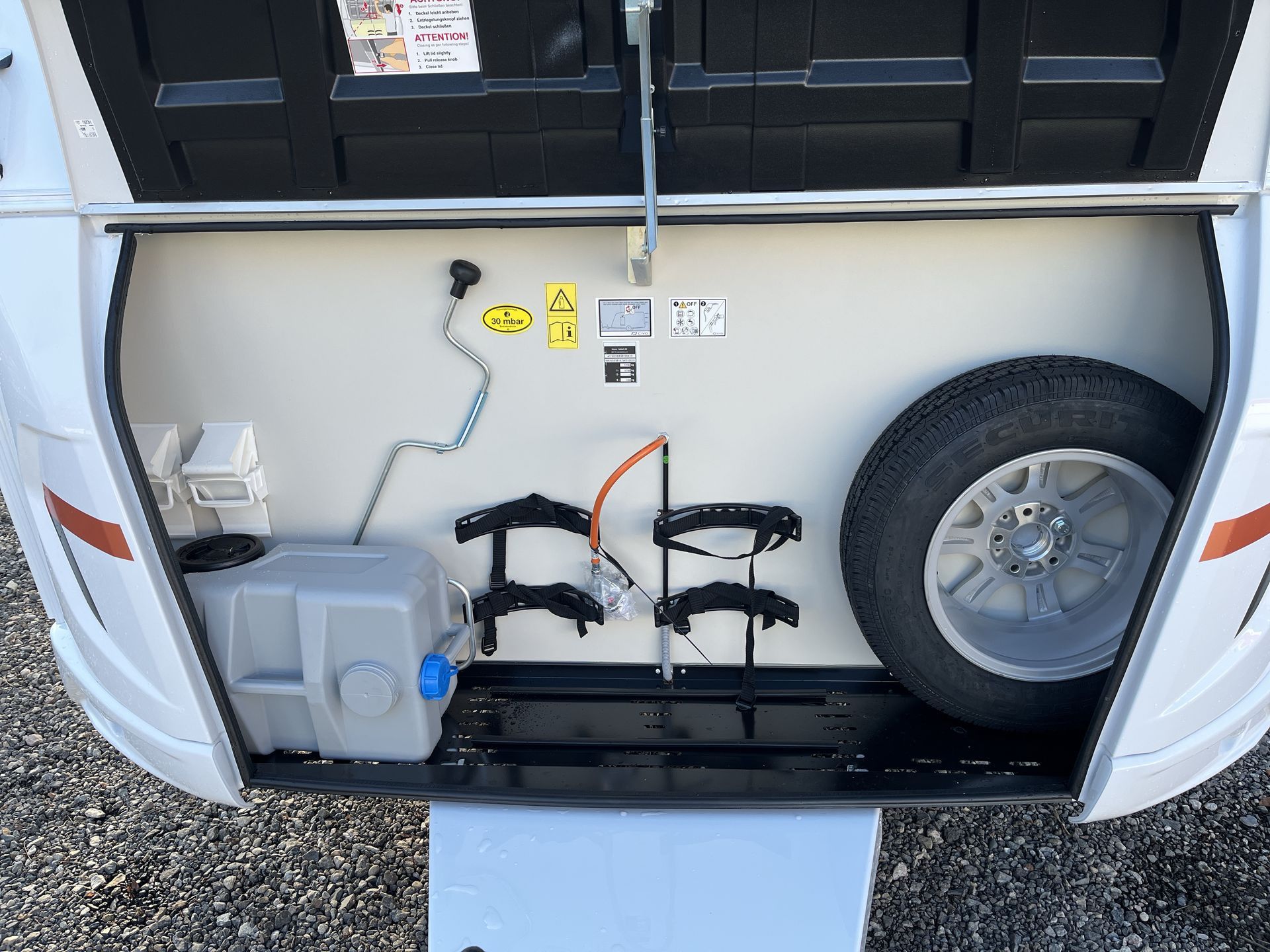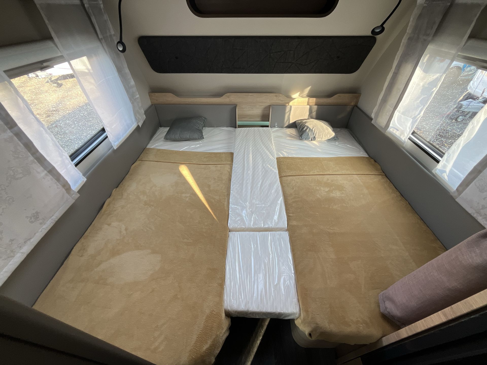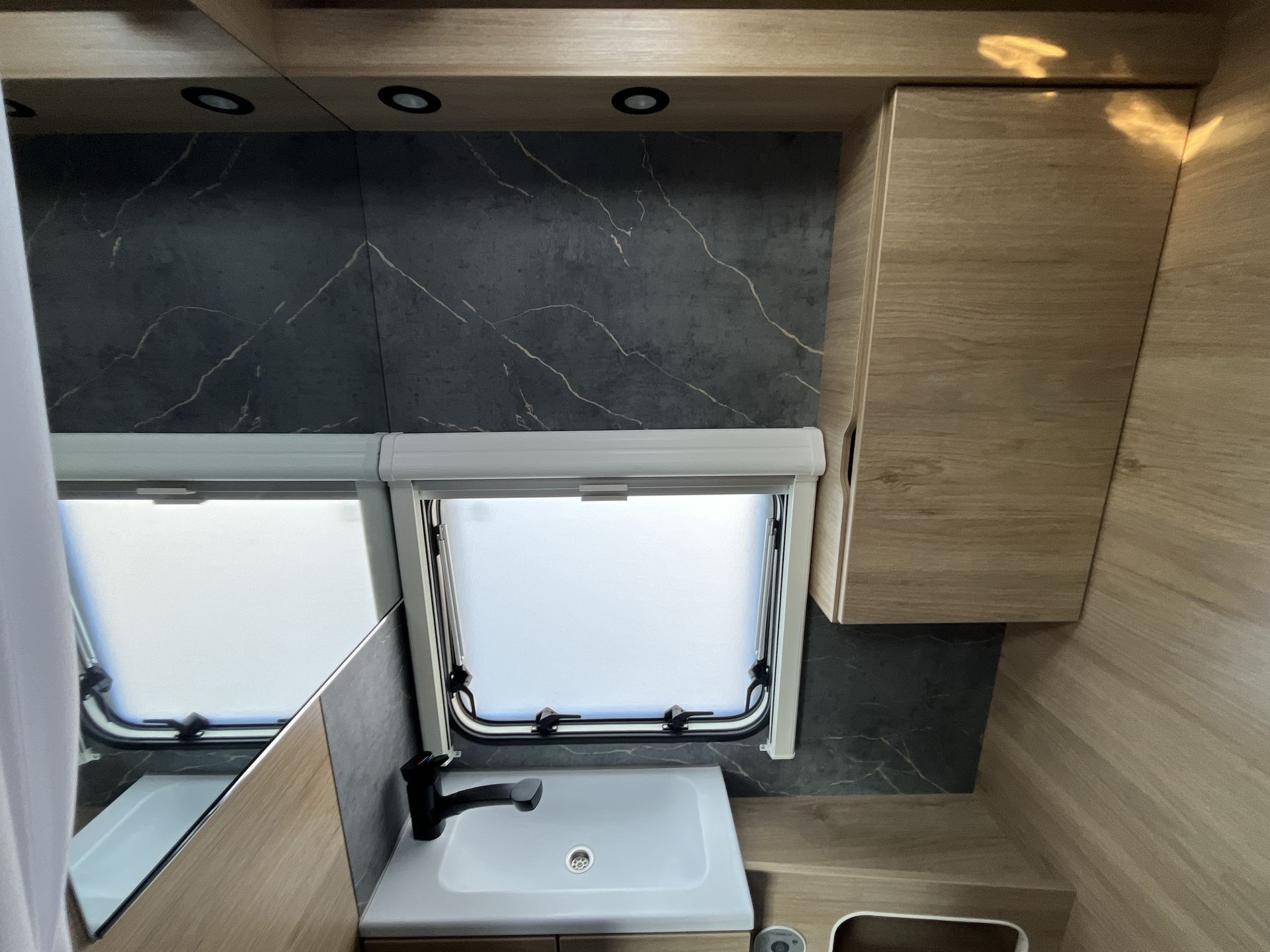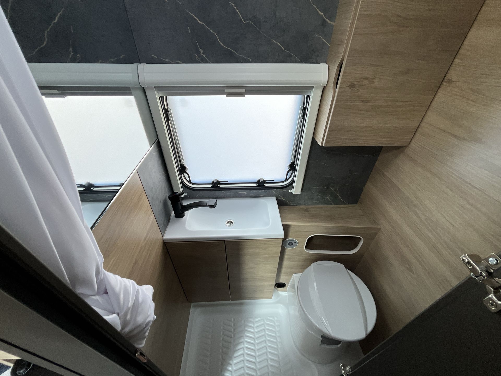 ADVANCED PAKET: střešní okno 70x50 cm s kombinovanou roletkou, moskytiéra vstupních dveří, bojler Truma Therme (230V), mobilní odpadní nádrž 25 l, vybavení sprchy