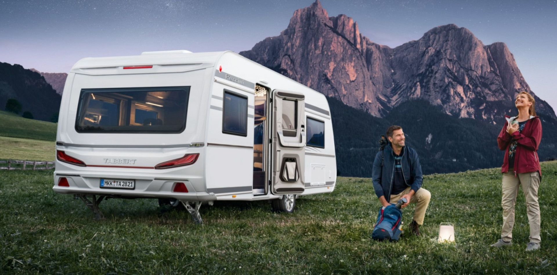 NÁSTAVBA: záruka těsnosti nástavby 10 let, boční stěny z profilovaného plechu, vnější uzamykatelná servisní dvířka (dle modelu), integrovaný prostor na plynové láhve s hliníkovou podlahou, vstupní dveře Tabbert Premium jednodílné s oknem, integrovaný vstupní schůdek, 3. brzdové světlo, LED vnější osvětlení s pohybovým senzorem, GFK střecha se zvýšenou odolností proti kroupám, zadní světla Tabbert, kombi roletky v oknech (zatemňovací + moskytiéra), tónovaná vyklápěcí dvojitá okna se záclonami vč. kombi roletky, střešní okno (1 x 40x40 cm; 1 x 70x50 cm; 1x 28x28 cm - na WC,pouze s moskytiérou) s kombi roletkou