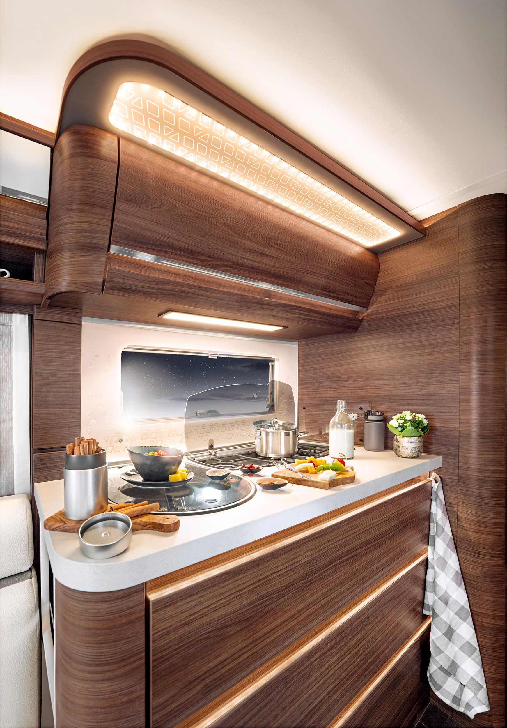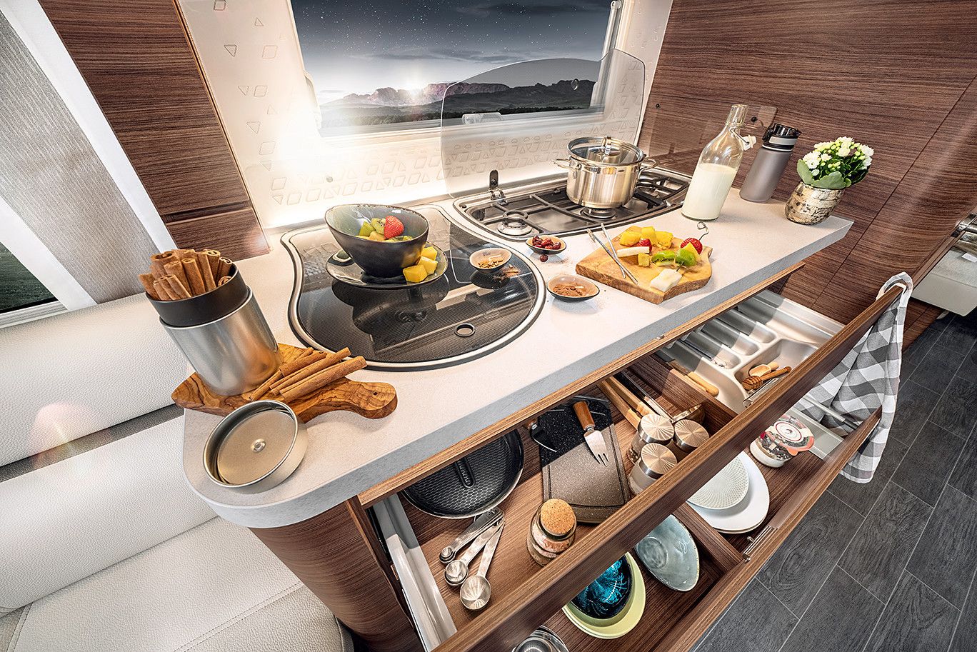 KUCHYŇKA A KOUPELNA: tříhořákový vařič s nerezovým dřezem a skleněným krytem, lednice Dometic 153 l se systémem AES (12V / 230V / plyn - podle modelu), velké skříňky s funkcí soft-close, zrcadlová skříňka s policemi v koupelně, lavicové WC Thetford, utěsněná záchodová šachta