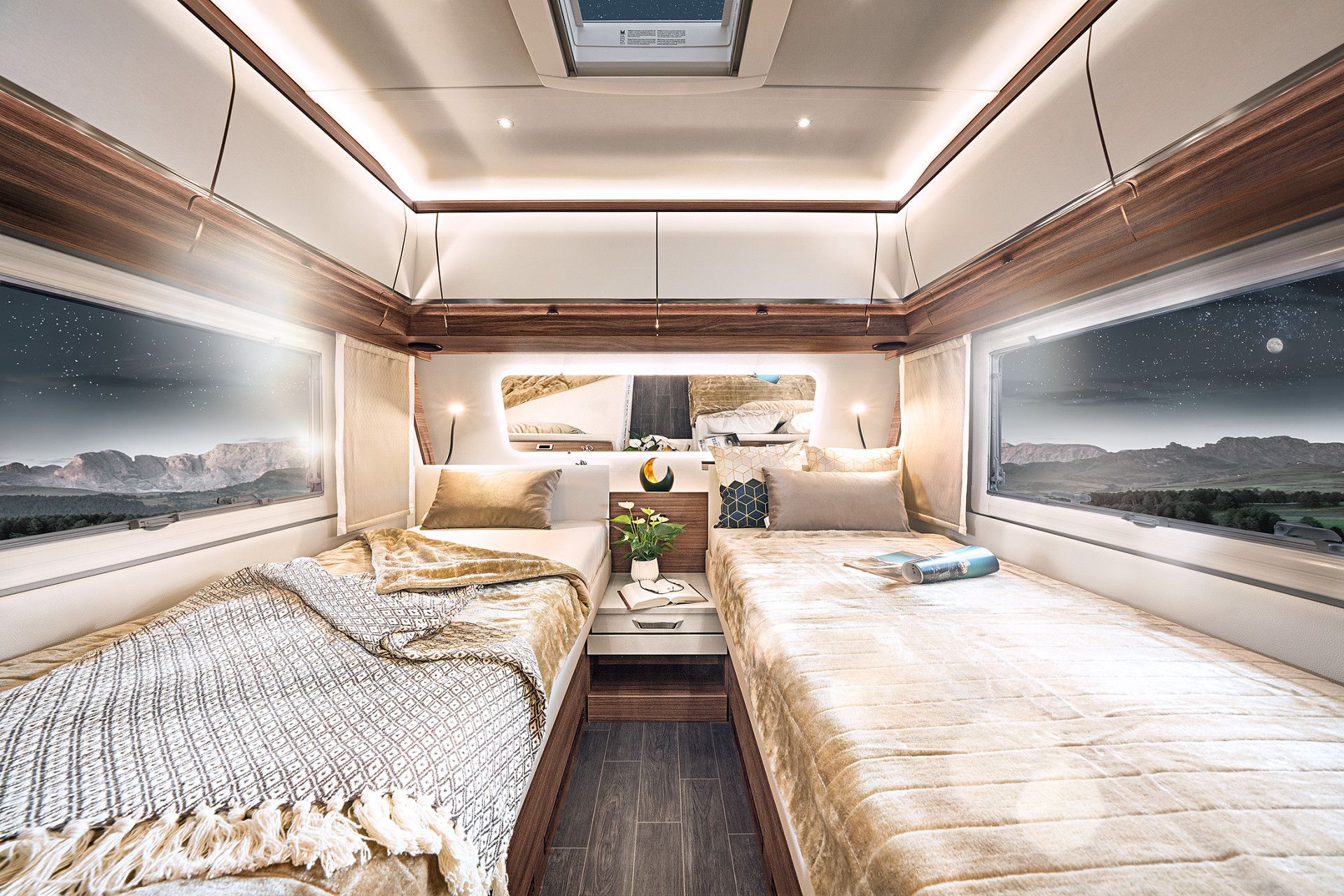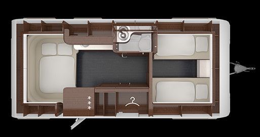 OBYTNÝ PROSTOR: dekor nábytku "Dark Oak", skříňky a úložné prostory s odvětráním, vinylová podlaha, stůl s teleskopickou nohou, úložné prostory nad postelí, skříňky a další úložné prostory u sedací soupravy, dřevěné posuvné dveře k oddělení pokojů, pevná lůžka s 5-ti zónovými matracemi, možnost rozložení sedací soupravy na komfortní lůžko, čalounění "Silver Pearl"