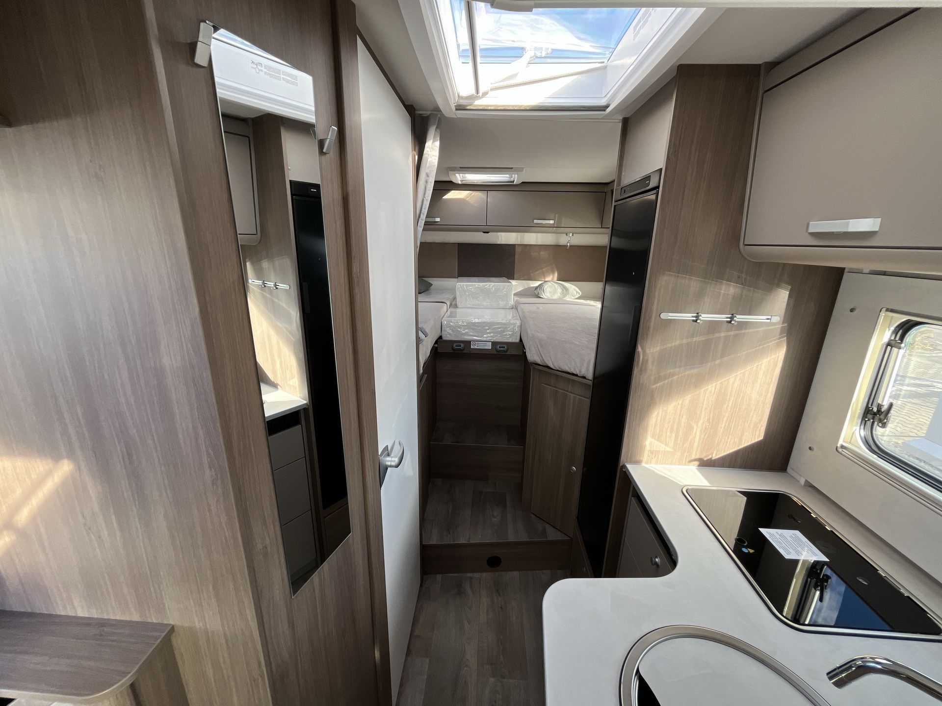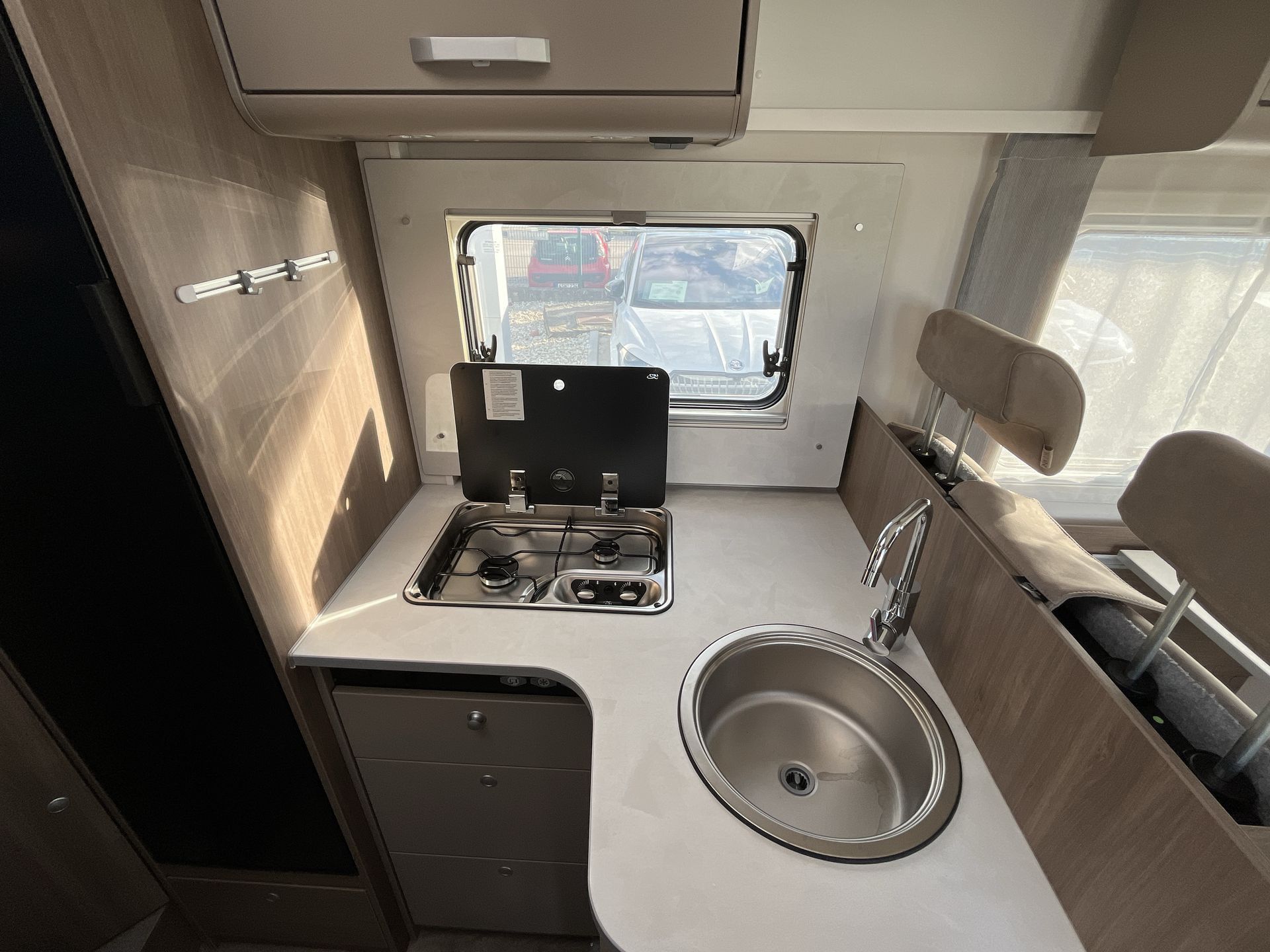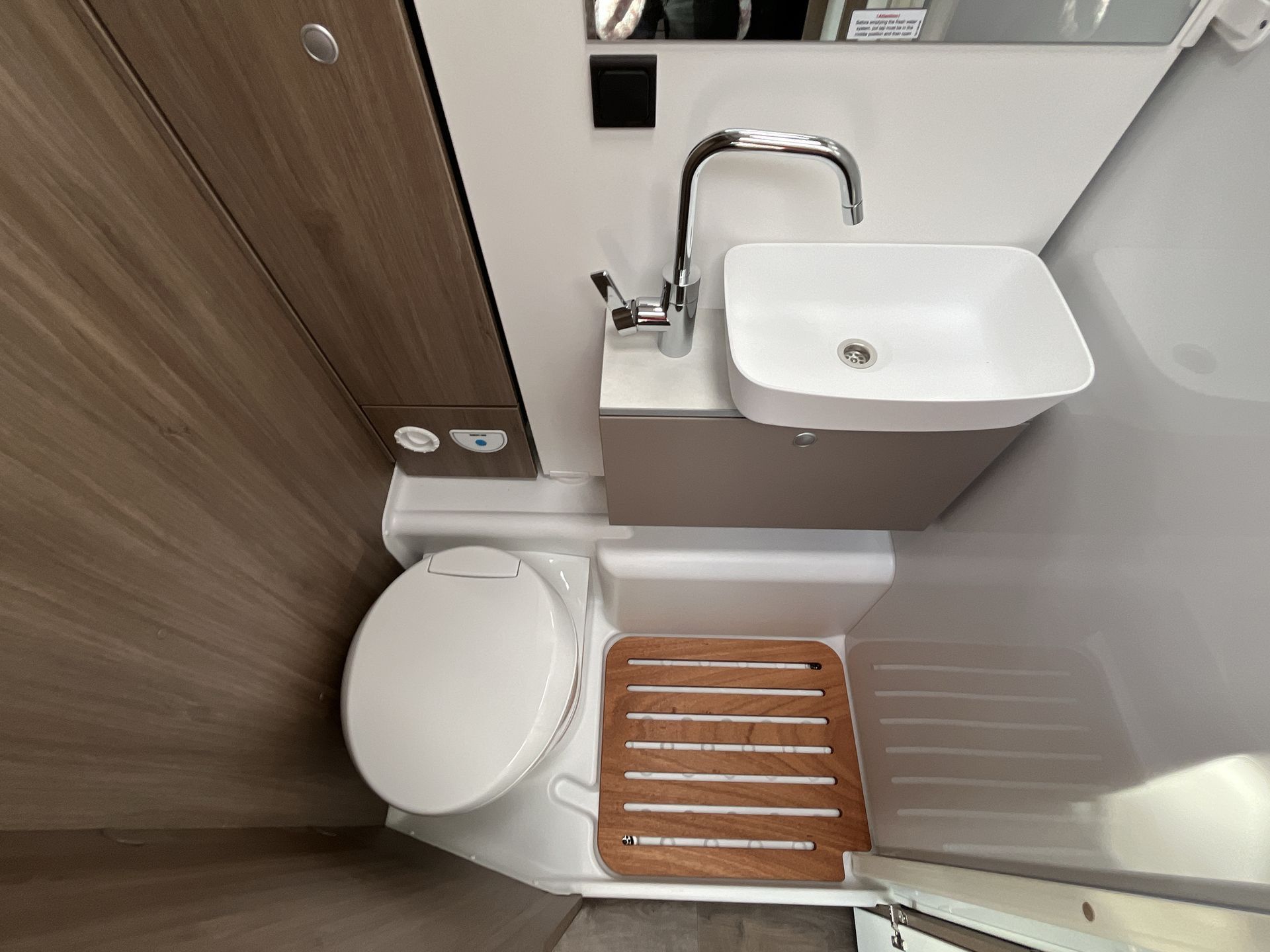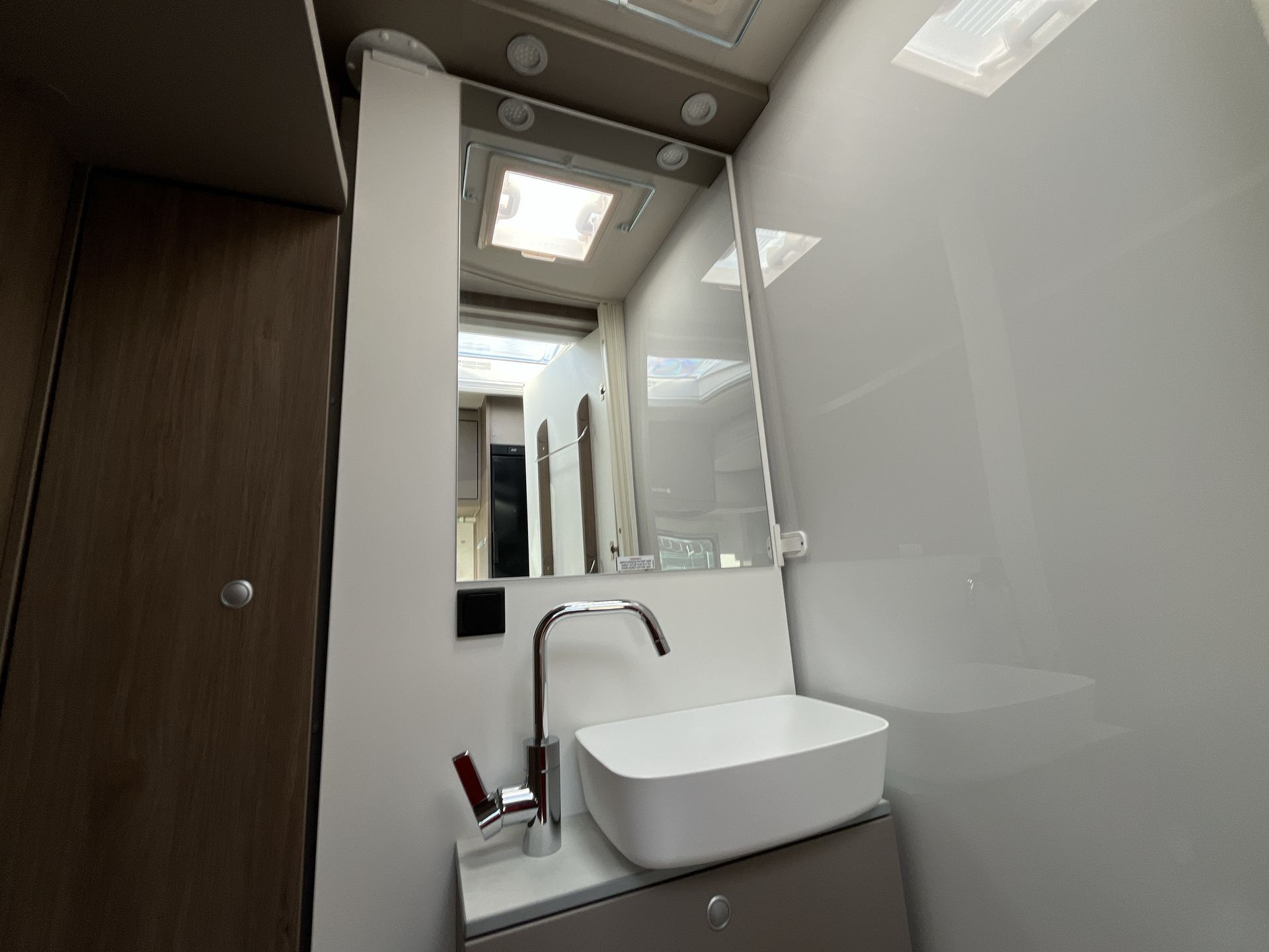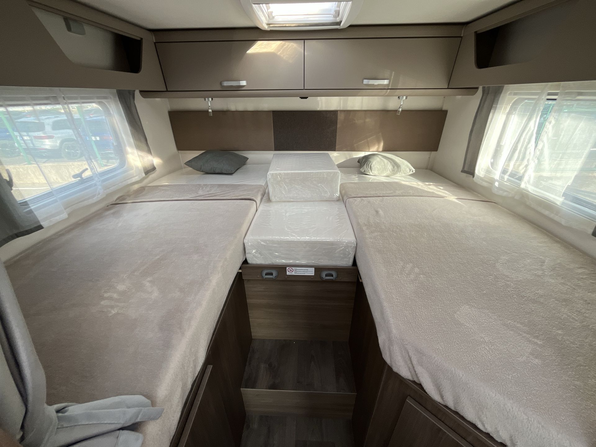 Přední otočná sedadla Captain Chair, airbag řidiče a spolujezdce, motorová klimatizace manuální, tónovaná a elektricky ovládaná okna v kabině řidiče, centrální zamykání dveří v kabině řidiče, palubní počítač s ukazatelem vnější teploty, DAB anténa ve zpětném zrcátku, držák na telefon / tablet vč. USB zásuvky, dojezdová sada pro pneu Fix & Go Kit, příprava rádia vč. 4 reproduktorů, přední nárazník v barvě vozidla, 7 let záruka na těsnost nástavby, střecha a zadní stěna odolná proti krupobití, polohovatlená dvojitá boční okna s roletou a sítí proti hmyzu, prostorná garáž se zatížením 150 kg, elektrický vstupní schůdek, LED osvětlení interiéru a exteriéru, výkonná baterie AGM 95 Ah pro obytnou část, kontrolní panel nástavby, vnitřní zásuvky 230V, vnější připojení pro 230V s jističem, USB zásuvka, centrální osvětlení u vstupních dveří, plynové topení Combi 6 s integrovaným 10 l bojlerem, kuchyňská deska s nerezovým dřezem a skleněným krytem, tříhořákový vařič s pojistkou hoření a se skleněným krytem, LEd osvětlení nad kuchyňskou linkou, pákové mísící baterie v kuchyni i koupelně, nádrž čisté vody vč. bojleru 122 litrů, odpadní nádrž 92 litrů, WC s elektrickým splachováním, skříňka se zrcadlem, integrované LED osvětlení, střešní okno s ochrannou síťkou, ergonomicky tvarované sedáky, komfortní matrace s odnímatelnými potahy na všech lůžkách, laťový rošt na pevných lůžkách, Isofix pro 2 sedačky.