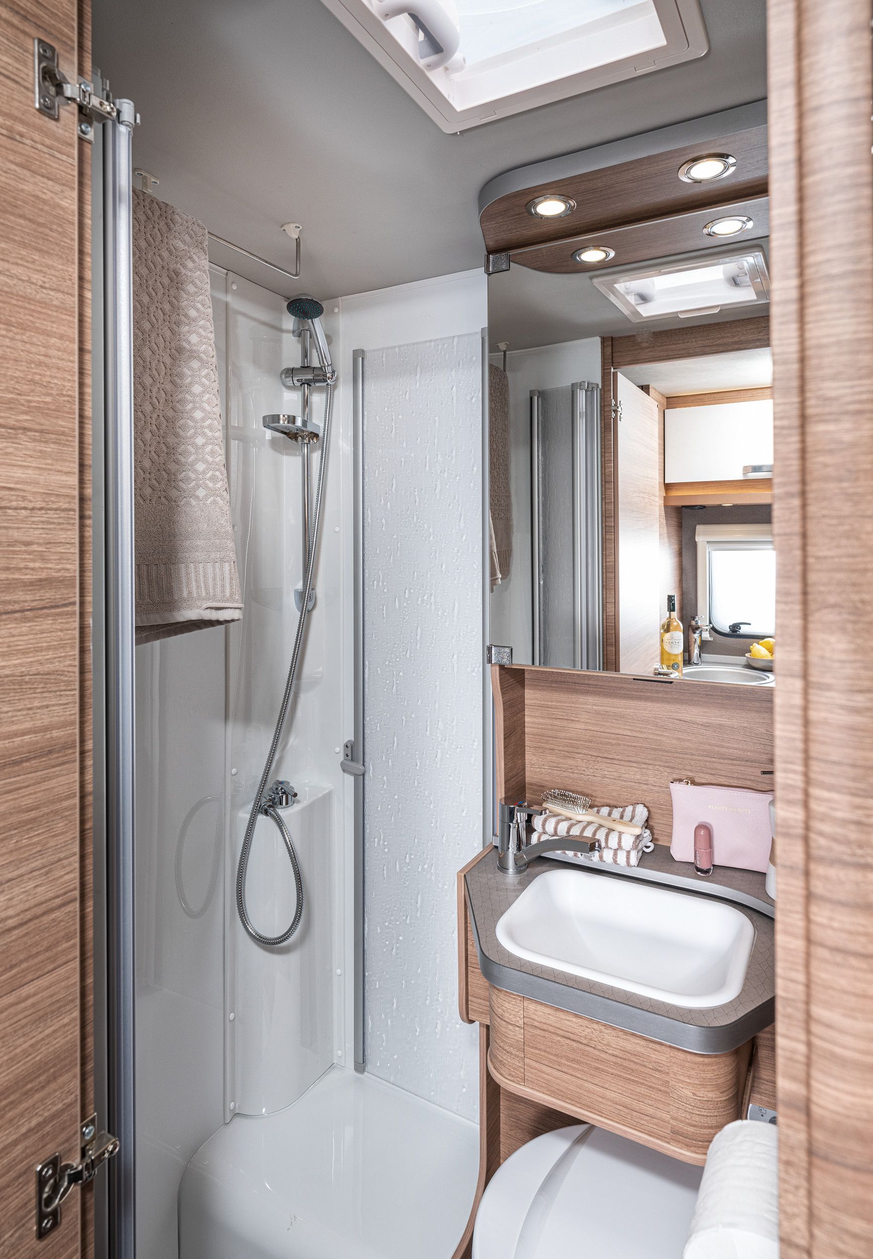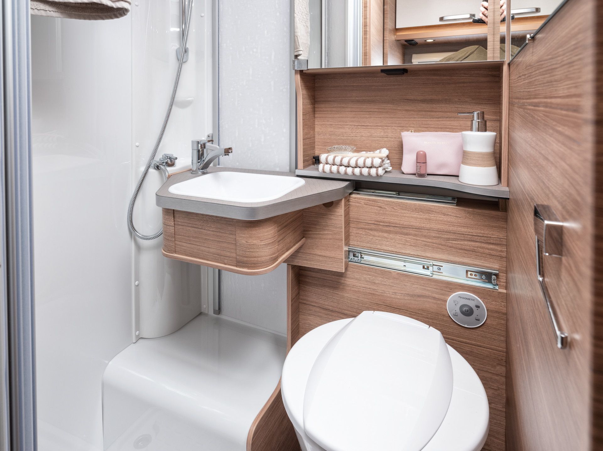 KOUPELNA: skříňka se zrcadlem, věšák, sprcha s pevnou zástěnou, otočná kazetová toaleta Dometic