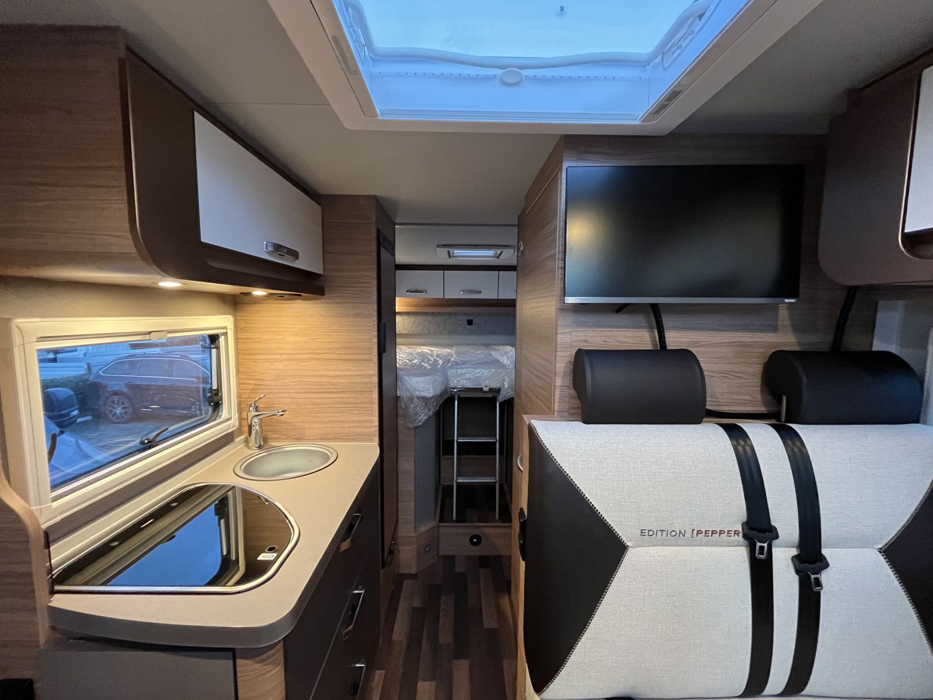 ELEKTRO: CEE venkovní přípojka 230V s jističem, 2x USB zásuvka, LED osvětlení interiéru, nabíječka a booster na baterii nástavby, 3x zásuvka 230V, ambientní osvětlení, anténa Oyster 60 Premium, Twin vč. 24" SMART TV + držák TV
