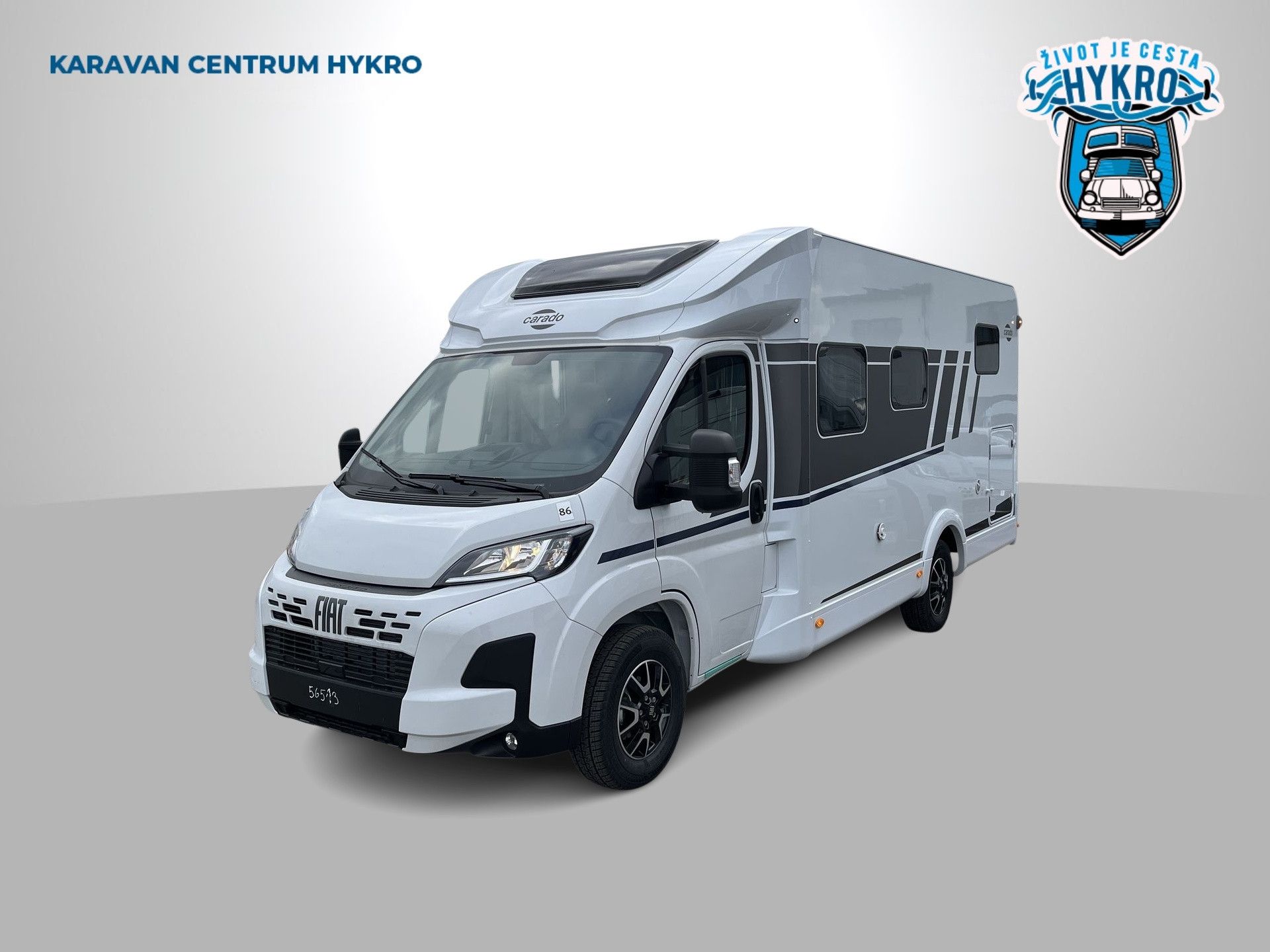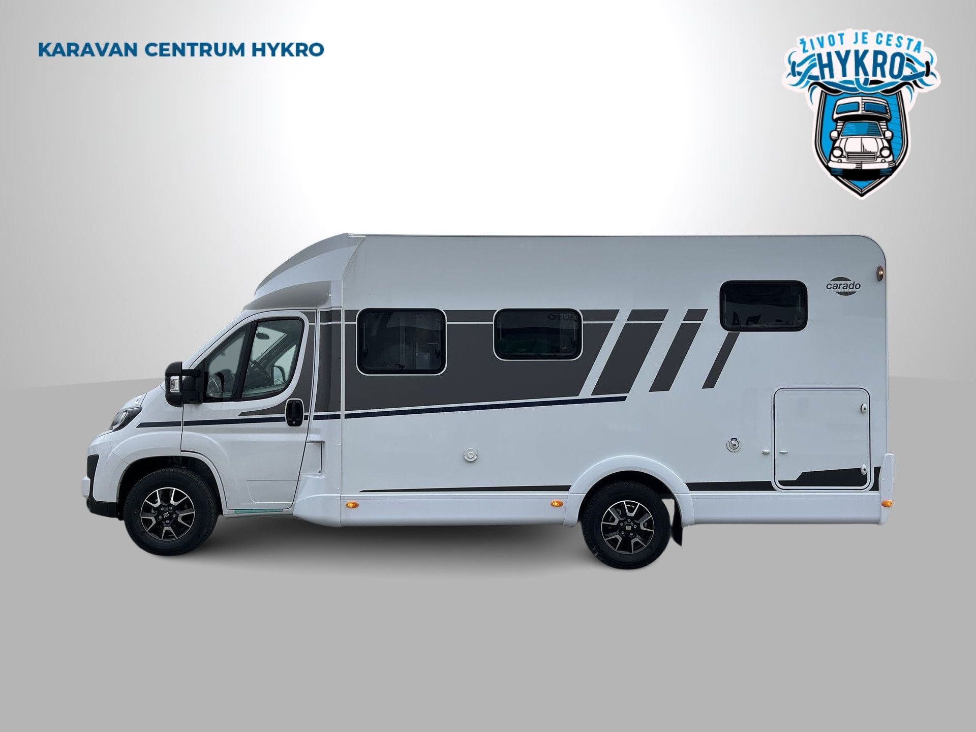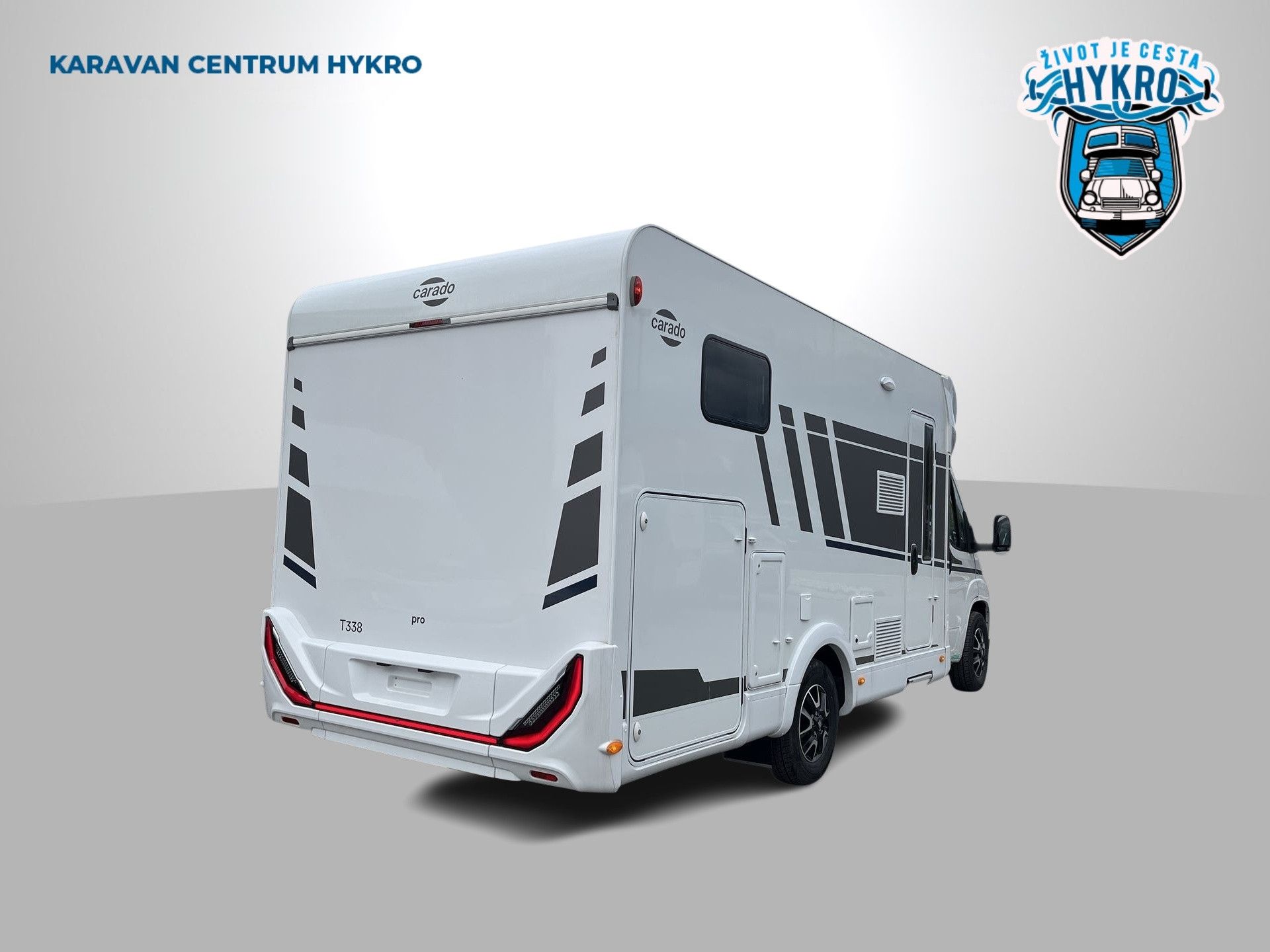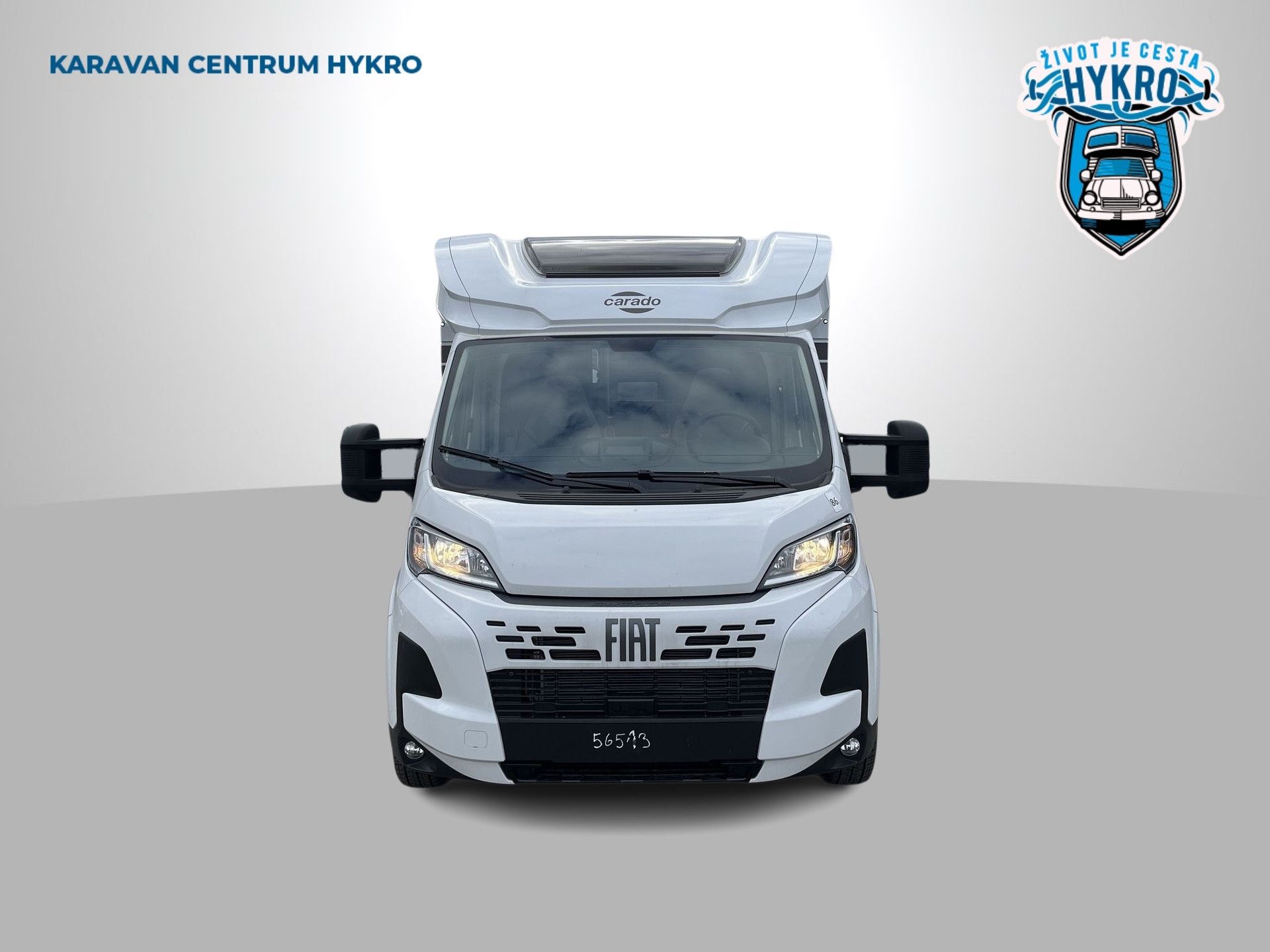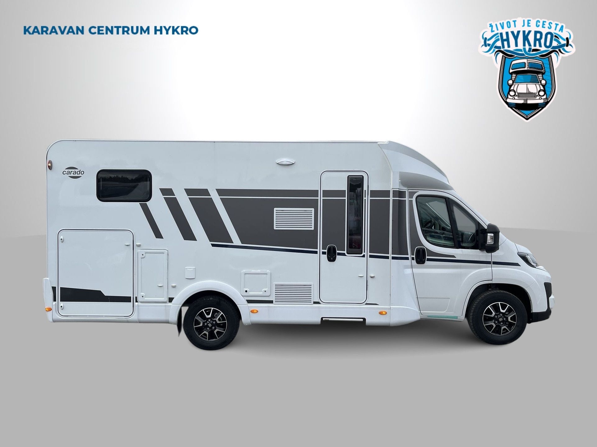 Rodinný polointegrovaný obytný vůz Carado T338 na podvozku Fiat Ducato pro 4 osoby na jízdu i na spaní v oblíbeném půdorysu s manuální převodovkou.