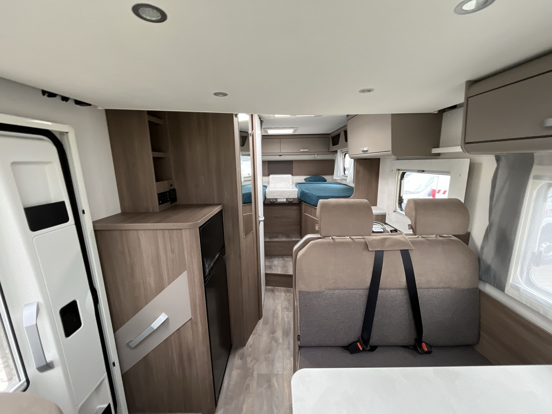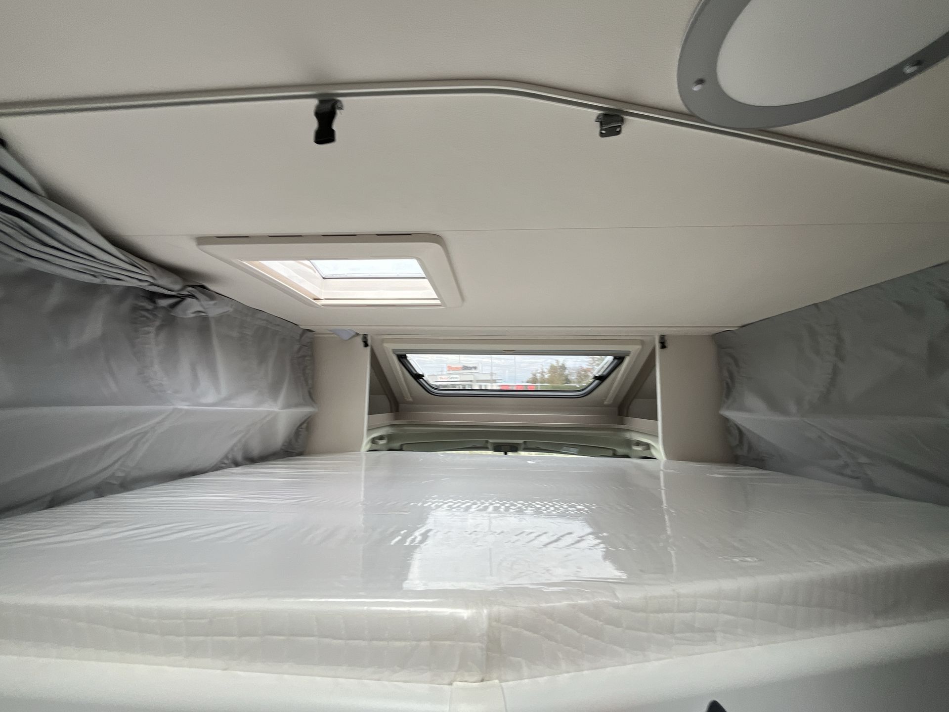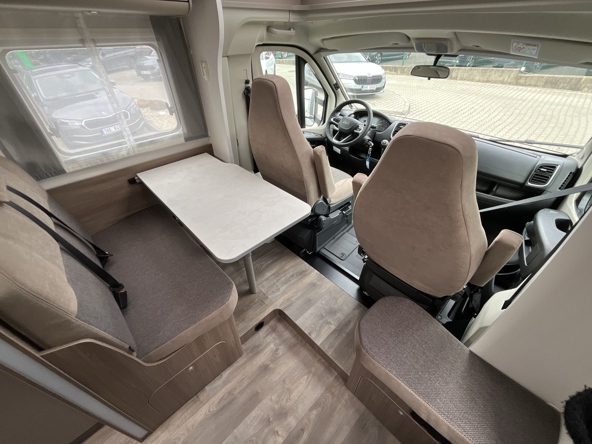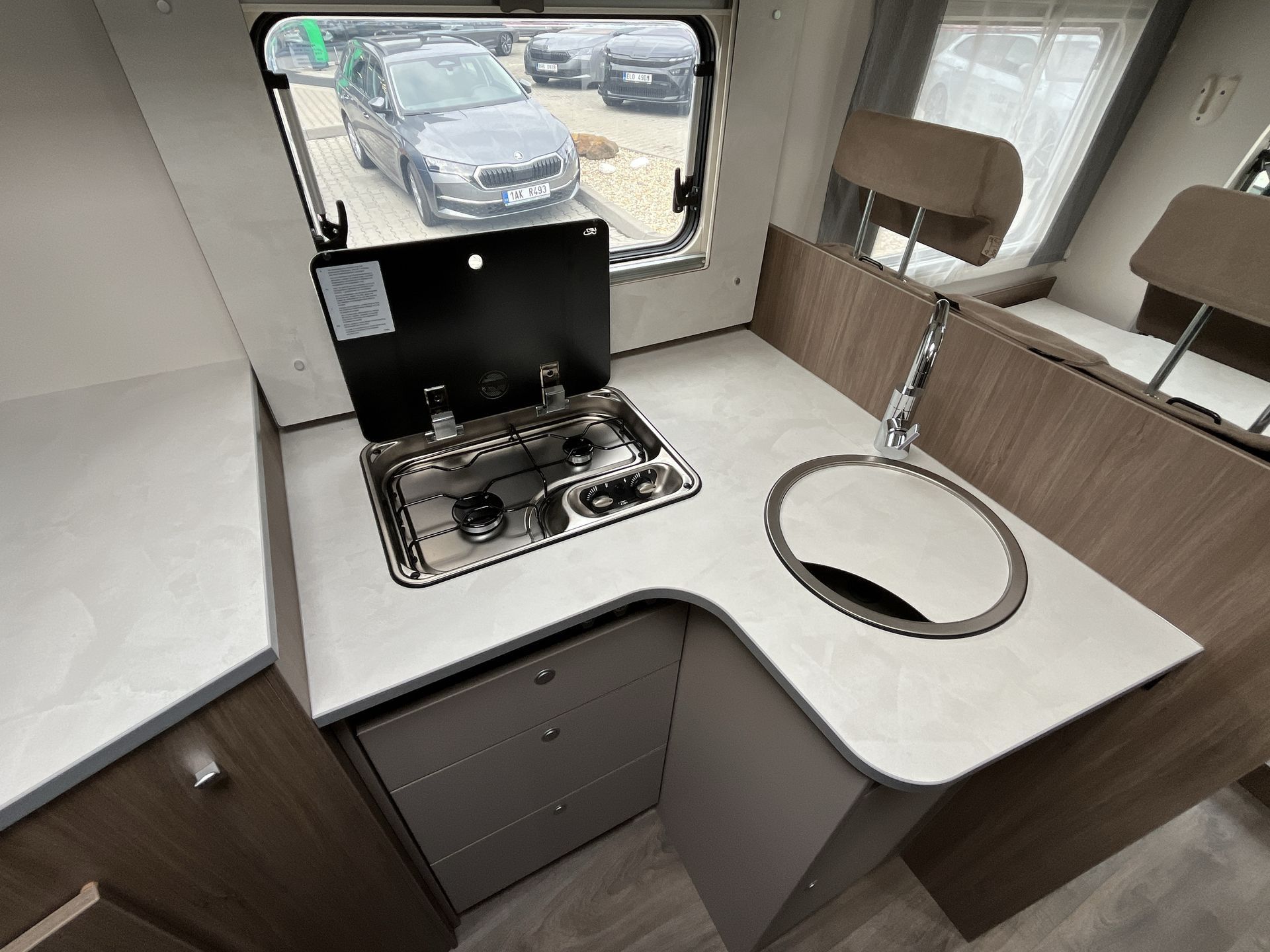 Přední otočná sedadla Captain Chair, airbag řidiče a spolujezdce, motorová klimatizace manuální, tónovaná a elektricky ovládaná okna v kabině řidiče, centrální zamykání dveří v kabině řidiče, palubní počítač s ukazatelem vnější teploty, DAB anténa ve zpětném zrcátku, držák na telefon / tablet vč. USB zásuvky, dojezdová sada pro pneu Fix & Go Kit, příprava rádia vč. 4 reproduktorů, přední nárazník v barvě vozidla, 7 let záruka na těsnost nástavby, střecha a zadní stěna odolná proti krupobití, polohovatlená dvojitá boční okna s roletou a sítí proti hmyzu, prostorná garáž se zatížením 150 kg, elektrický vstupní schůdek, LED osvětlení interiéru a exteriéru, výkonná baterie AGM 95 Ah pro obytnou část, kontrolní panel nástavby, vnitřní zásuvky 230V, vnější připojení pro 230V s jističem, USB zásuvka, centrální osvětlení u vstupních dveří, plynové topení Combi 6 s integrovaným 10 l bojlerem, kuchyňská deska s nerezovým dřezem a skleněným krytem, tříhořákový vařič s pojistkou hoření a se skleněným krytem, LEd osvětlení nad kuchyňskou linkou, pákové mísící baterie v kuchyni i koupelně, nádrž čisté vody vč. bojleru 122 litrů, odpadní nádrž 92 litrů, WC s elektrickým splachováním, skříňka se zrcadlem, integrované LED osvětlení, střešní okno s ochrannou síťkou, ergonomicky tvarované sedáky, komfortní matrace s odnímatelnými potahy na všech lůžkách, laťový rošt na pevných lůžkách, Isofix pro 2 sedačky.