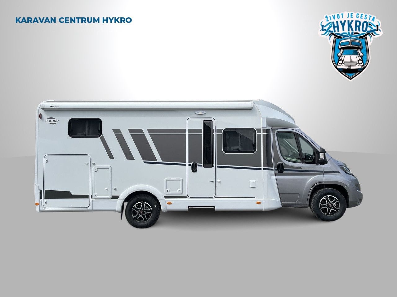 PRO+ Paket: OPTIC PACK 1 - lakovaný přední nárazník, černě lakovaná mřížka chladiče, mlhovky; OPTIC PACK 2 - 16" litá kola, kožený volant a řadící páka; podvozek v odstínu Artense Grey metallic, střešní okno nad kabinou řidiče, levé dveře garáže (80x85 cm), rámová okna Seitz 7, polepy Carado Alternativ, izolace odpadní nádrže, markýza 4.5m, velká lednice 156 l s odděleným mrazákem, remis žaluzie v kabině řidiče, polepy PRO+