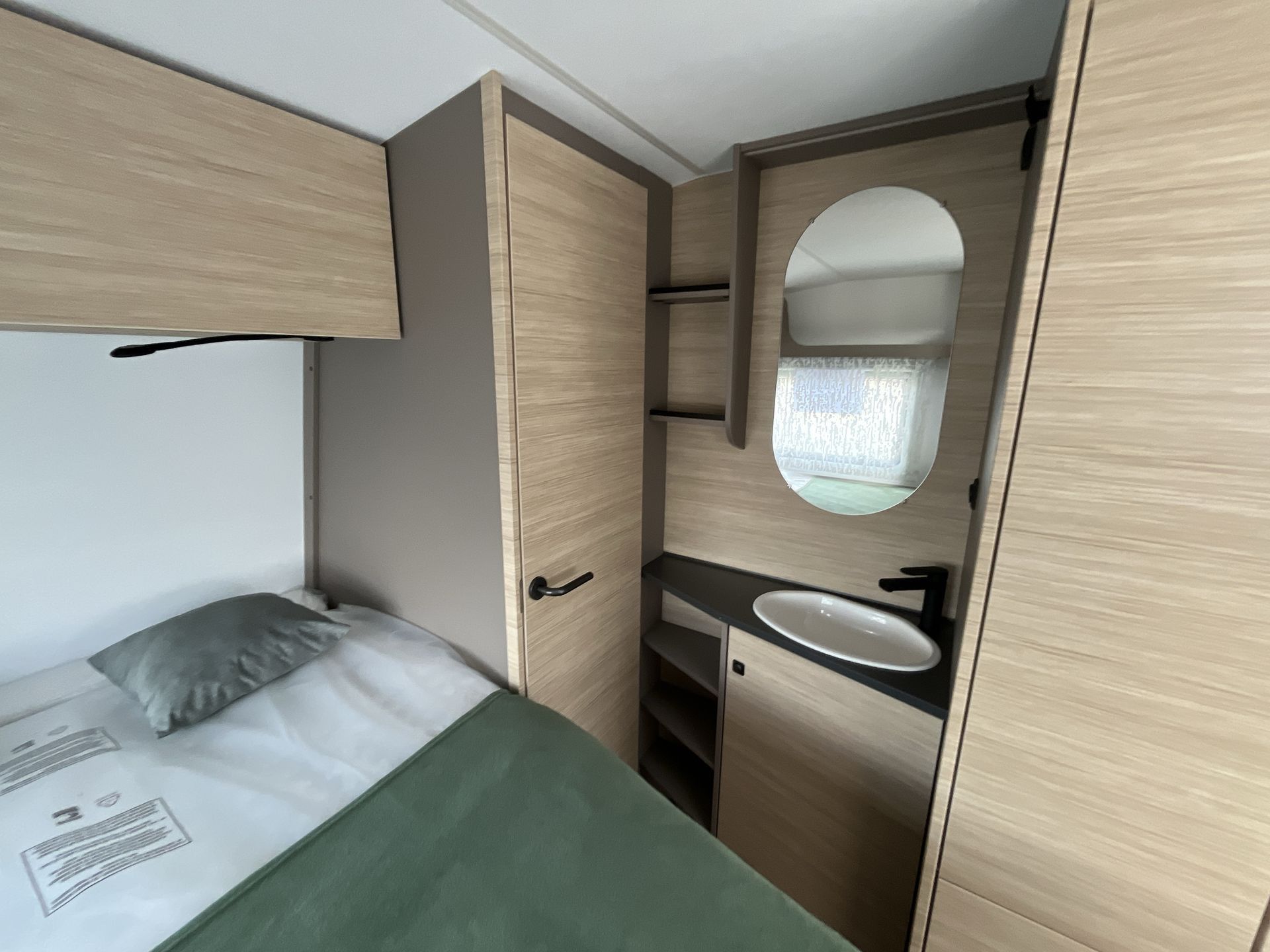 V ceně skladového karavanu je i tato příplatková výbava: držák kol, plstěné košíky a polštáře, moskytiéra vstupních dveří, bojler, servisní klapka 100x42 cm, navýšení celkové hmotnosti na 1 100 kg.