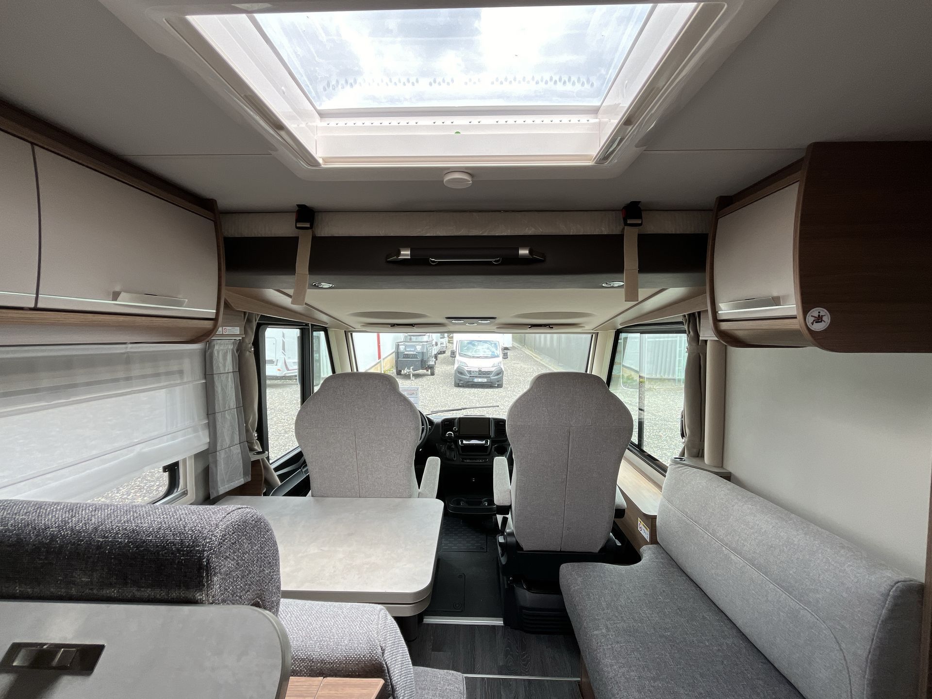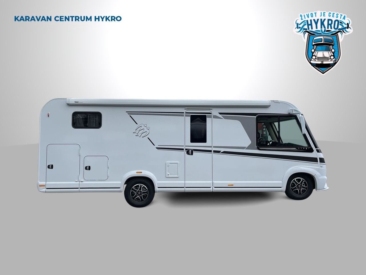 PŘÍPLATKOVÁ VÝBAVA V CENĚ VOZU: levé garážové dveře, rámová okna Seitz S7, kožený volant a řadící páka, elektrická parkovací brzda, přístrojová deska Techno Design, přední sedačky Aguti Premium, silný motor 180 PS, 8stupňová automatická převodovka, topení Truma Combi E, výsuv mezi zadními lůžky, zatemňovací roletky v kabině řidiče, polster ACTIVE ROYAL, ISOFIX pro 2 dětské sedačky