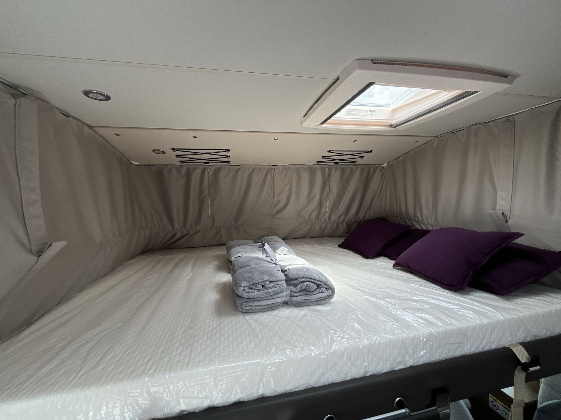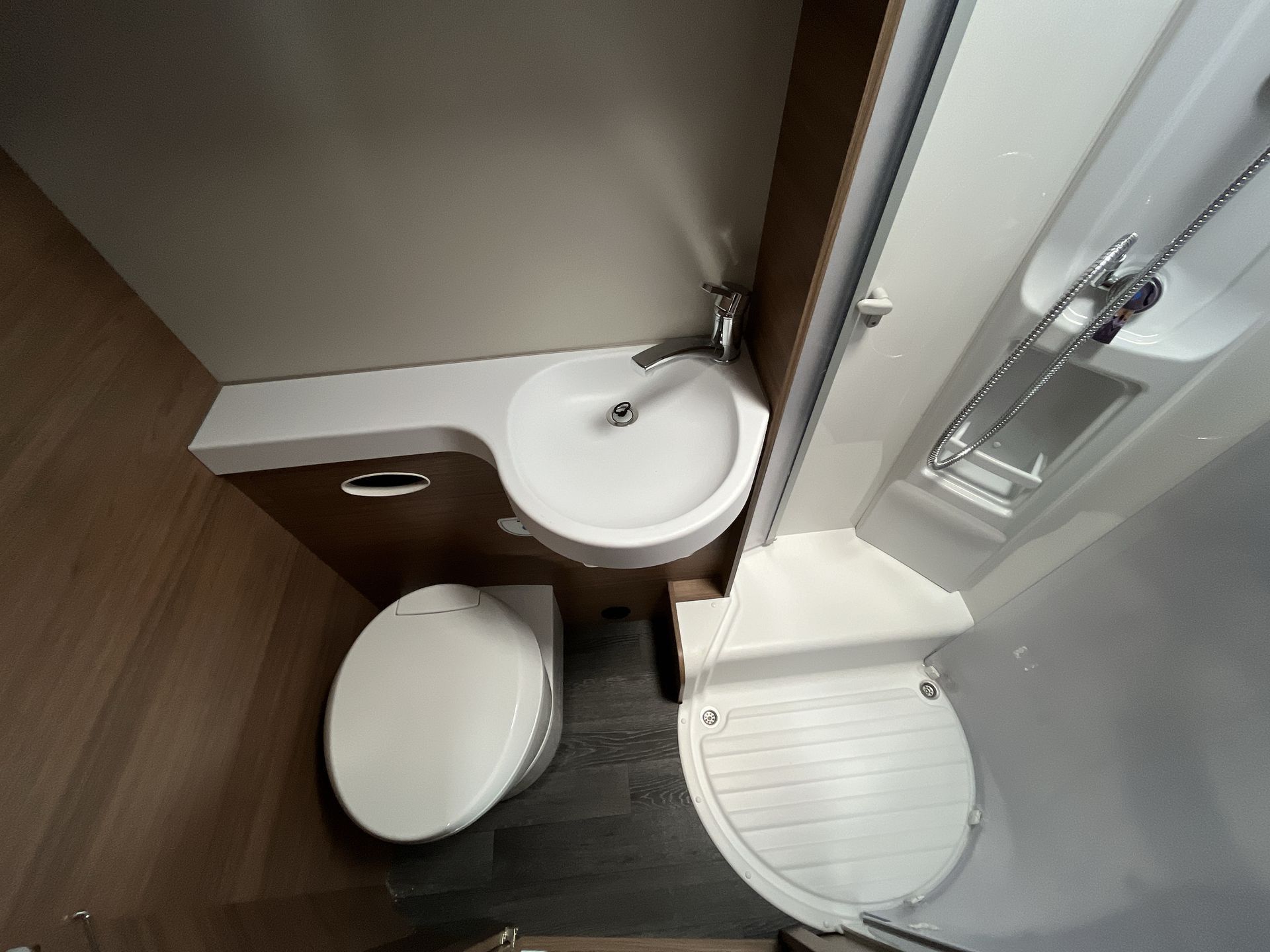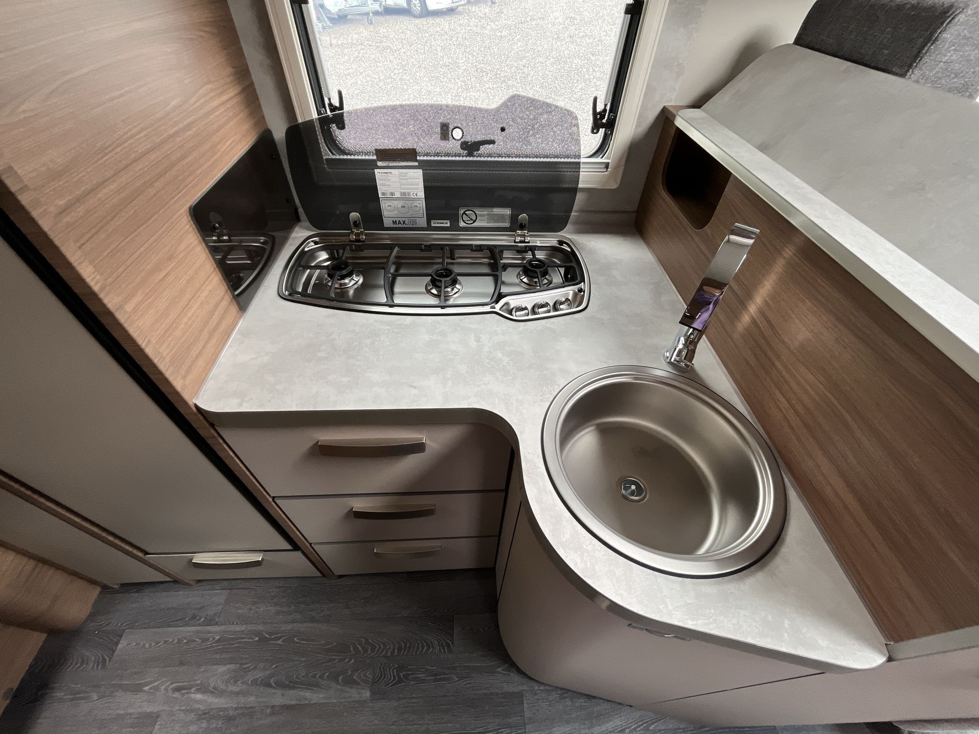 KUCHYŇKA + KOUPELNA: tříhořákový plynový vařič a nerezový dřez se skleněným krytem, kuchyňské zásuvky s funkcí soft-close, lednice 142 l se systémem AES, podélná komfortní koupelna se sprchovým koutem a umyvadlem, otočná kazetová toaleta Dometic, věšáčky v koupelně
