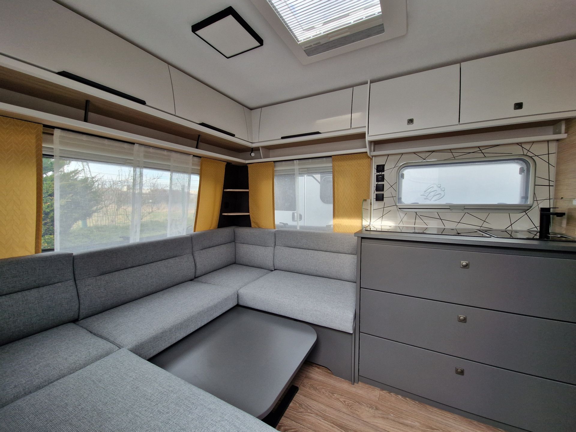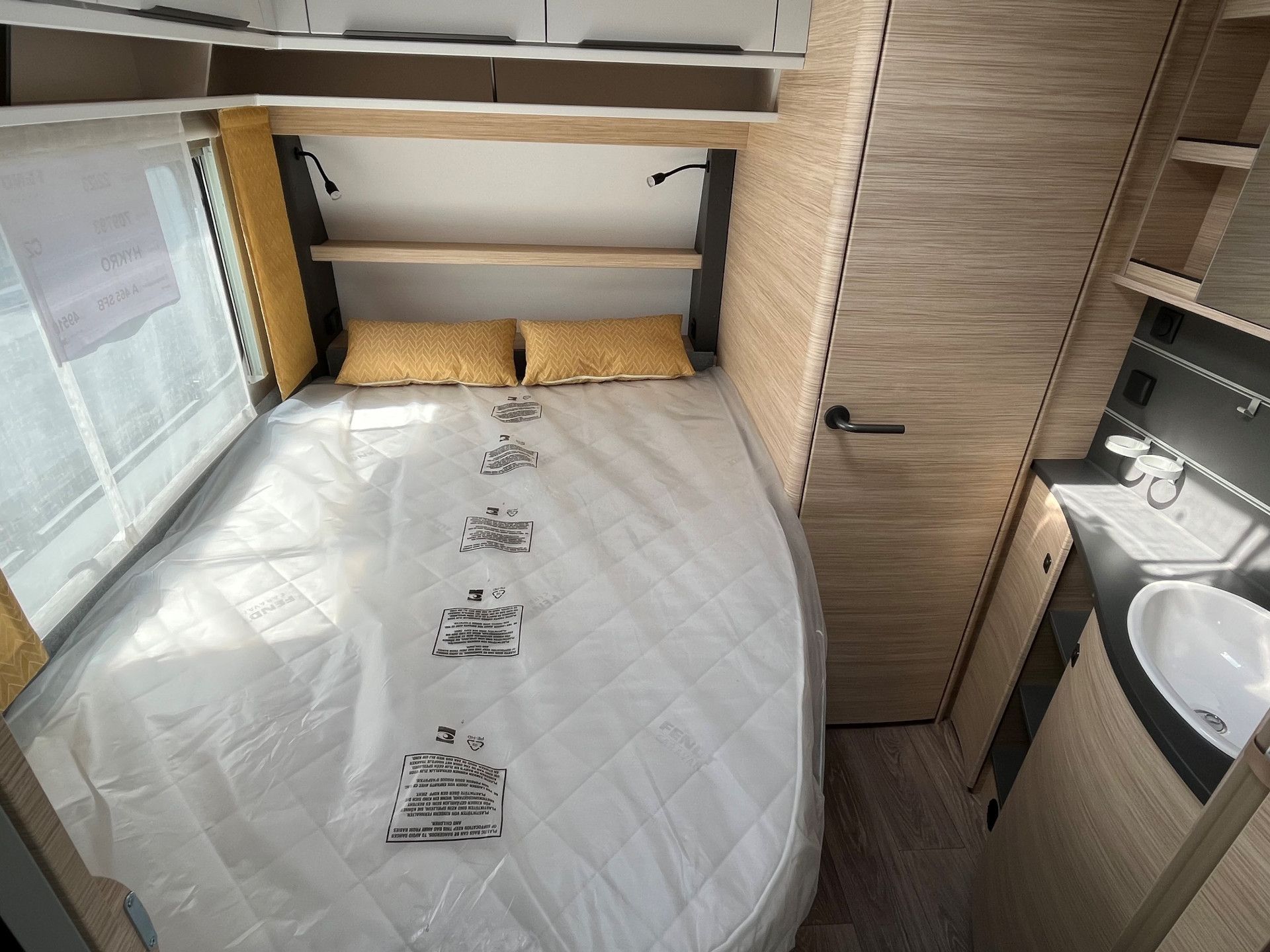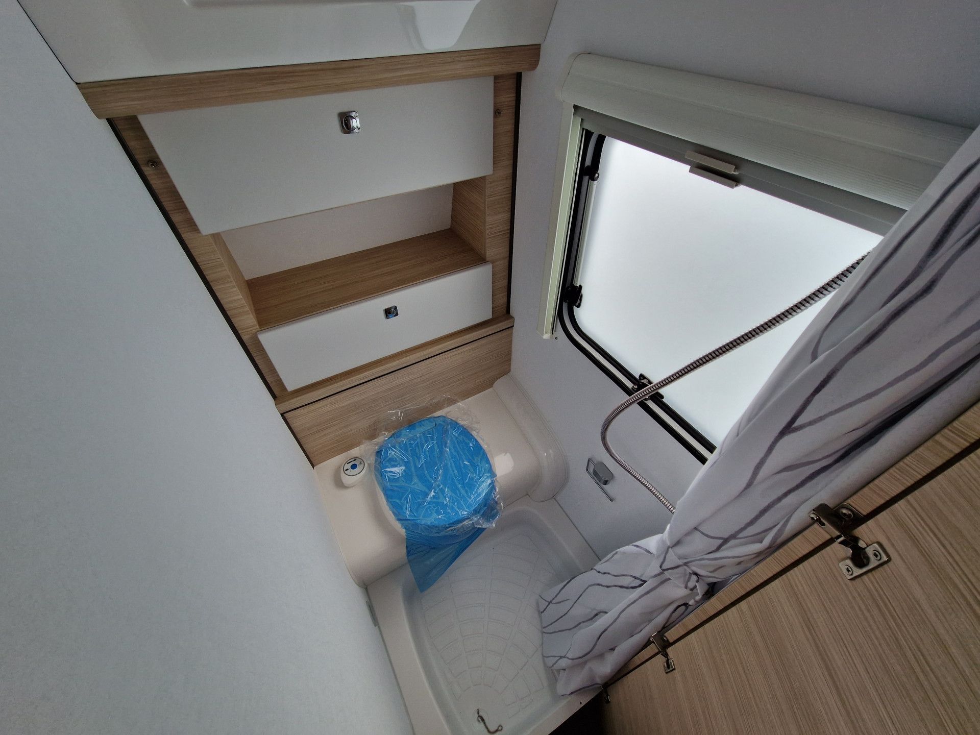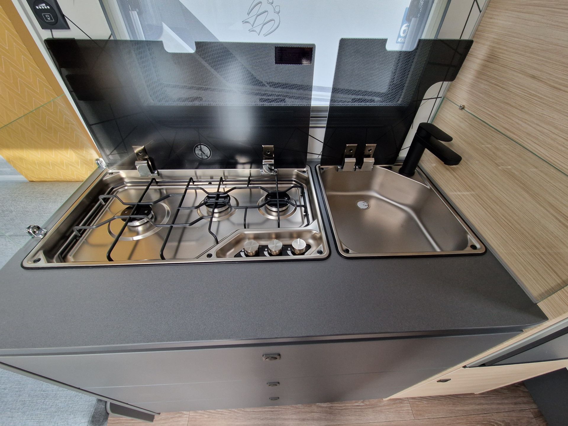 - KUCHYŇKA A KOUPELNA: integrovaný koš na odpad ve vstupních dveřích, LED osvětlení kuchyňské linky a koupelny, příborník, šatní věšáky, věšáky na ručníky, držák toaletního papíru, tříhořákový vařič s pojistkou hoření a nerezový dřez se skleněným krytem, lednice 133 l, mísící vodovodní baterie, zrcadlo s osvětlením v koupelně, splachovací kazetové WC s ukazatelem naplnění, skříňky v kuchyni a koupelně s funkcí soft-close, umyvadlo s odkládací plochou v koupelně, boční okno na WC s mlečným sklem a roletkami