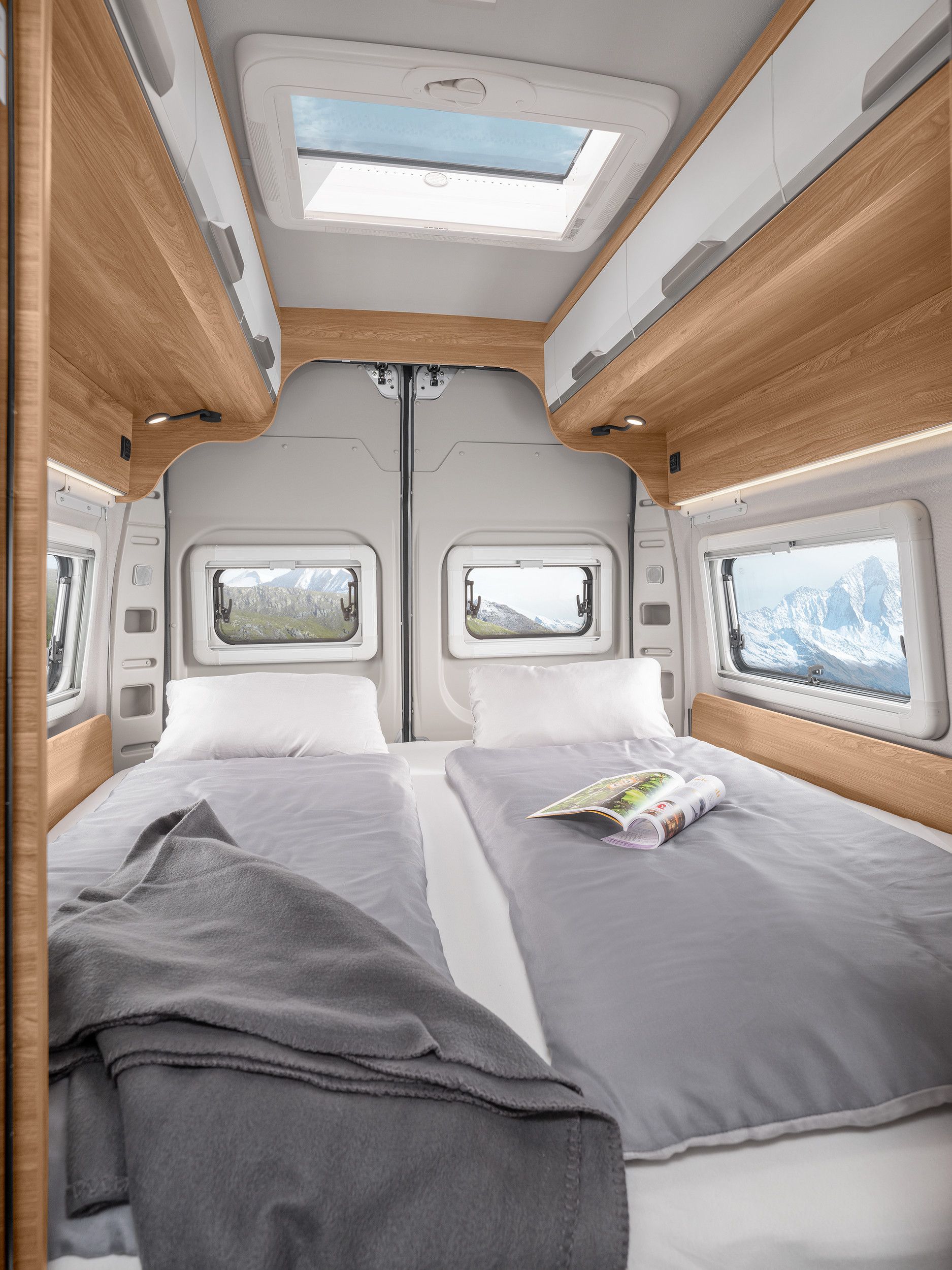 Obytná vestavba v delším provedení 636 cm - s podélnými lůžky pro 3 osoby na jízdu a pro 4 osoby na spaní v provedení Platinum Selection skladem v březnu 2026. FOTOGRAFIE JSOU POUZE ILUSTRAČNÍ!