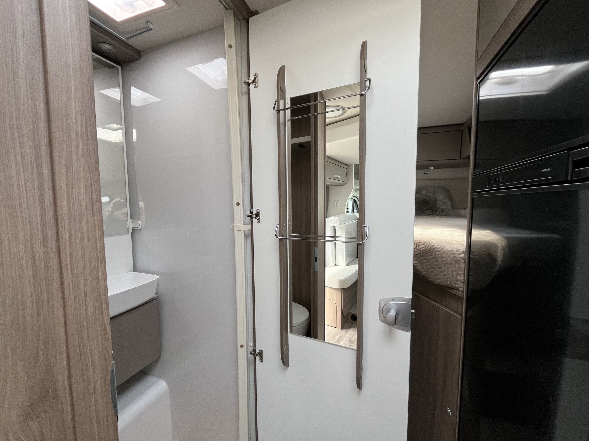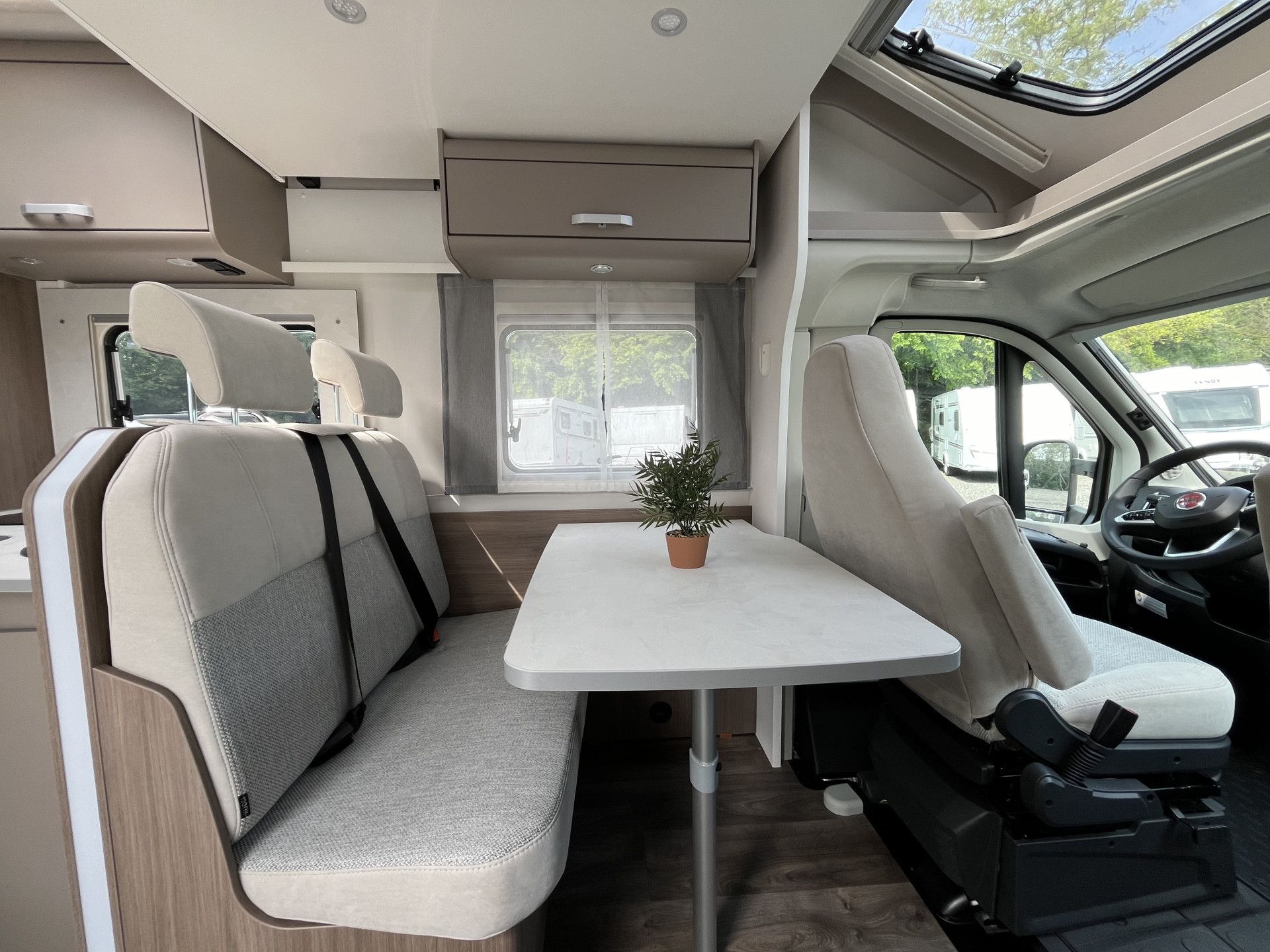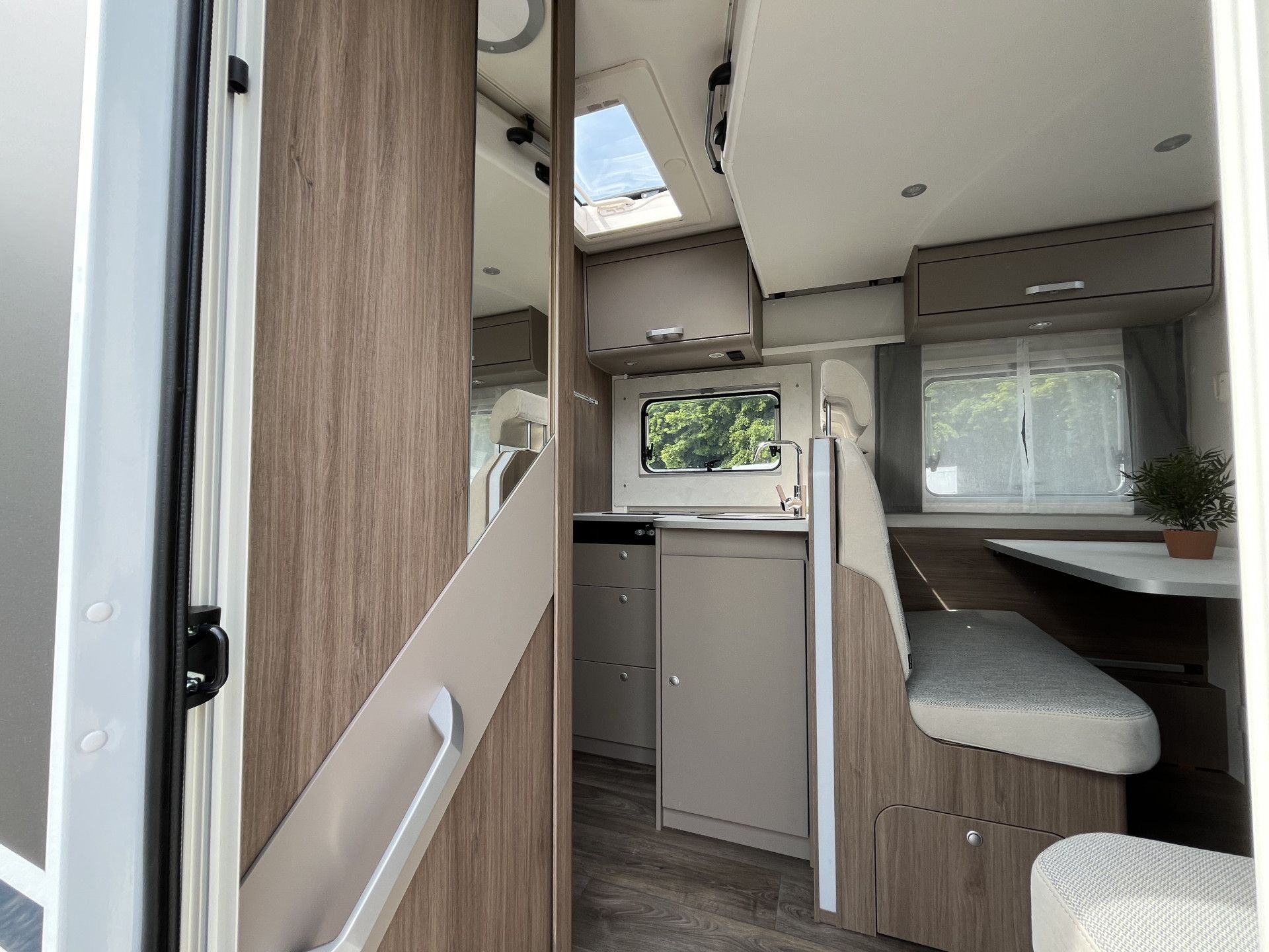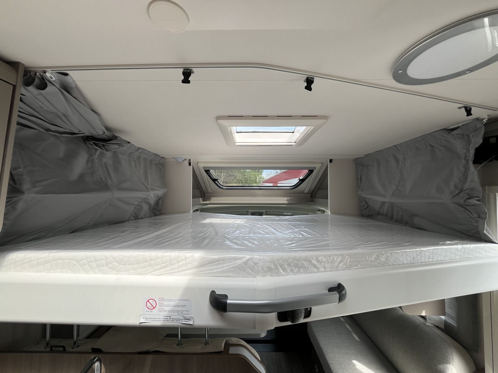 - Přední otočná sedadla Captain Chair, airbag řidiče a spolujezdce, motorová klimatizace manuální, tónovaná a elektricky ovládaná okna v kabině řidiče, centrální zamykání dveří v kabině řidiče, palubní počítač s ukazatelem vnější teploty, DAB anténa ve zpětném zrcátku, držák na telefon / tablet vč. USB zásuvky, dojezdová sada pro pneu Fix & Go Kit, příprava rádia vč. 4 reproduktorů, přední nárazník v barvě vozidla, 7 let záruka na těsnost nástavby, střecha a zadní stěna odolná proti krupobití, polohovatlená dvojitá boční okna s roletou a sítí proti hmyzu, prostorná garáž se zatížením 150 kg, elektrický vstupní schůdek, LED osvětlení interiéru a exteriéru, výkonná baterie AGM 95 Ah pro obytnou část, kontrolní panel nástavby, vnitřní zásuvky 230V, vnější připojení pro 230V s jističem, USB zásuvka, centrální osvětlení u vstupních dveří, plynové topení Combi 6 s integrovaným 10 l bojlerem, kuchyňská deska s nerezovým dřezem a skleněným krytem, tříhořákový vařič s pojistkou hoření a se skleněným krytem, LEd osvětlení nad kuchyňskou linkou, pákové mísící baterie v kuchyni i koupelně, nádrž čisté vody vč. bojleru 122 litrů, odpadní nádrž 92 litrů, WC s elektrickým splachováním, skříňka se zrcadlem, integrované LED osvětlení, střešní okno s ochrannou síťkou, ergonomicky tvarované sedáky, komfortní matrace s odnímatelnými potahy na všech lůžkách, laťový rošt na pevných lůžkách, Isofix pro 2 sedačky.