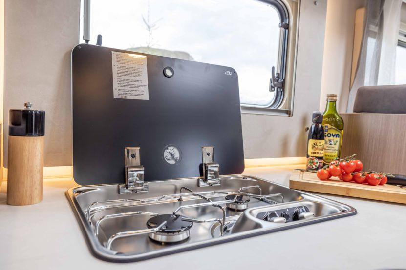 - tříhořákový vařič s nerezovým dřezem a skleněným krytem