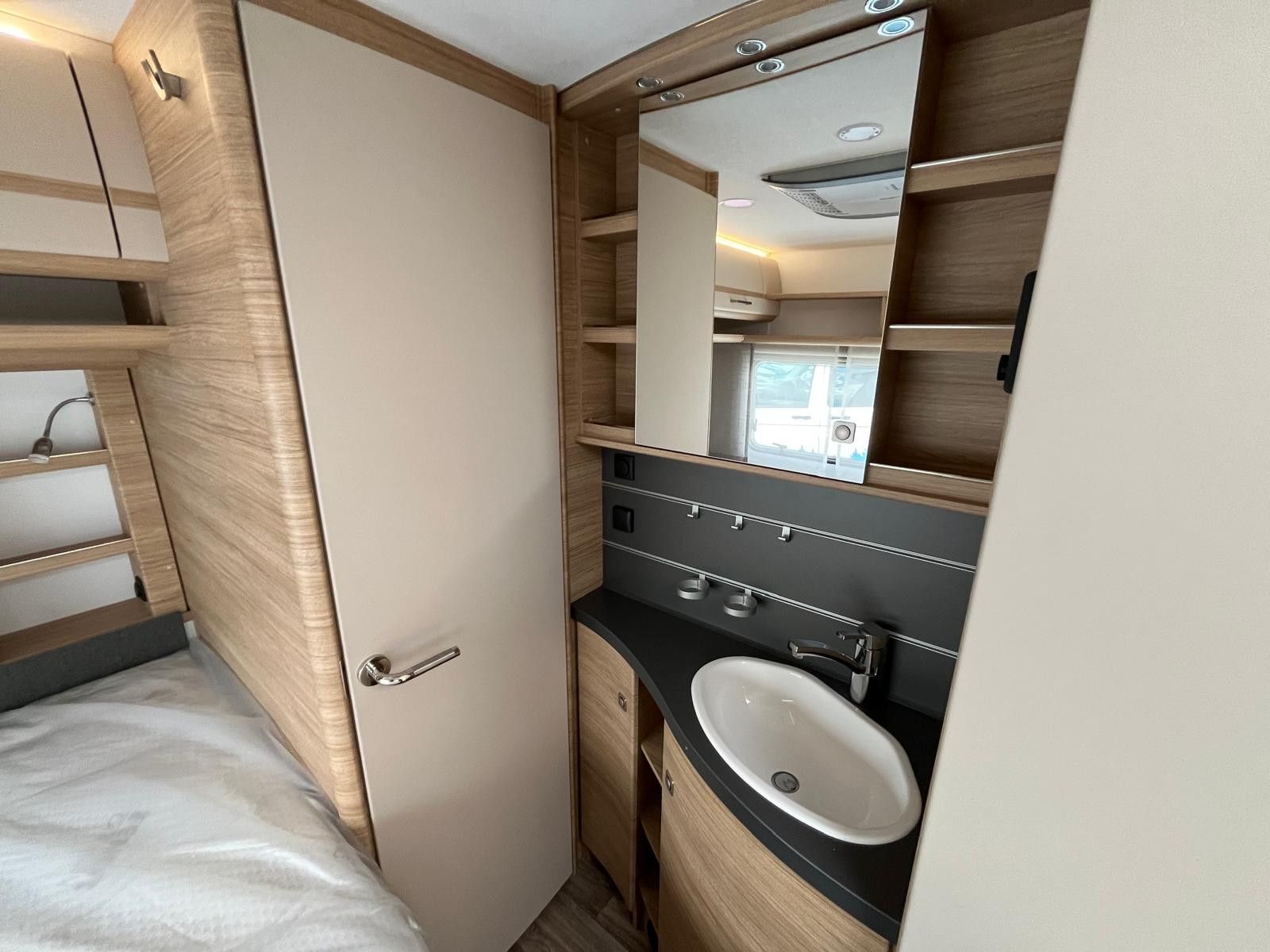 - KUCHYŇKA A KOUPELNA: integrovaný koš na odpad ve vstupních dveřích, LED osvětlení kuchyňské linky a koupelny, plynová trouba s grilem (pouze u 720 SKDW), příborník, věšáky na ručníky a držák toaletního papíru, tříhořákový vařič s pojistkou hoření a nerezový dřez se skleněným krytem (ne u 720 SKDW), tříhořákový sporák s automatikcým zapalováním vč. pojistky (pouze u 720 SKDW), lednice 133 l, sprchový kout (dle modelu), mísící vodovodní baterie, středová koupelna s velkými skříňkami, poličkami pod umyvadlem a podvíceným zrcadlem (dle modelu), zrcadlová skříňka v koupelně (dle modelu) splachovací kazetové WC s ukazatelem naplnění (dle modelu), skříňky v kuchyni a koupelně s funkcí soft-close, boční okno na WC s mlečným sklem a roletkami