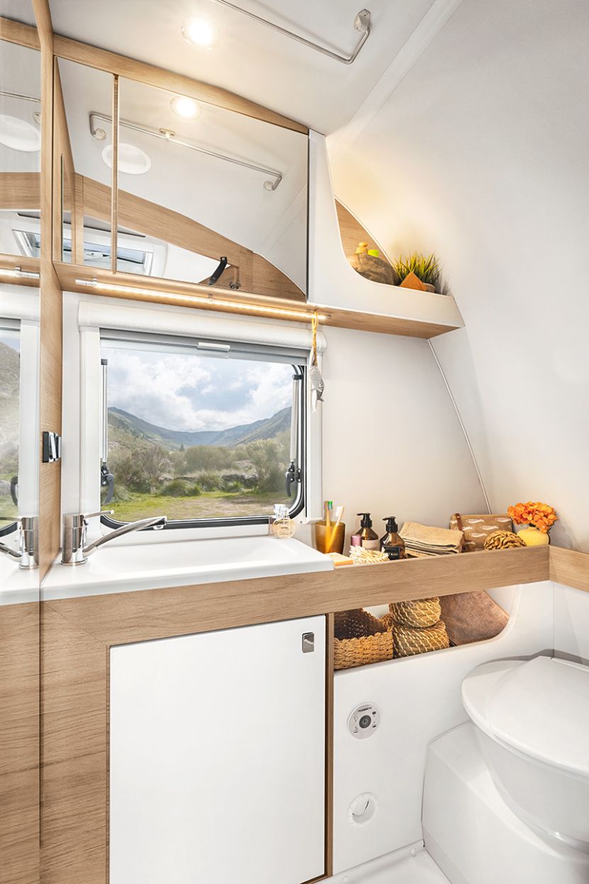KUCHYŇKA A KOUPELNA: přenosná indukční dvouplotýnka, lednice 98 l se systémem AES (podle modelu), nerezový dřez se skleněným krytem, skříňky s funkcí soft-close, komoda v koupelně se zrcadlem a poličkami, otočné kazetové WC Dometic, utěsněná záchodová šachta